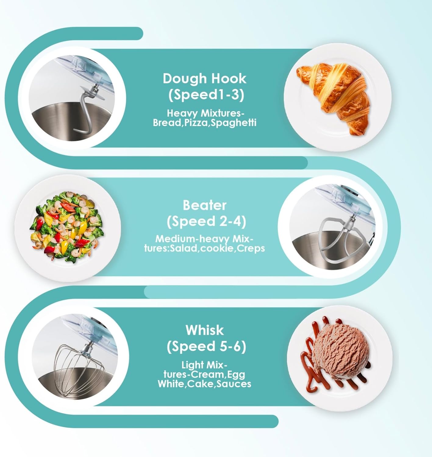 - 6 Speed, Easy to Use: This kitchen mixer features six adjustable speed settings and easy operation to meet your diverse mixing needs. The tilt-head feature allows for effortless switching between bowls and attachments.Its intuitive design ensures ease of use, making it ideal for both beginners and experienced bakers, delivering reliable performance for baking tasks.