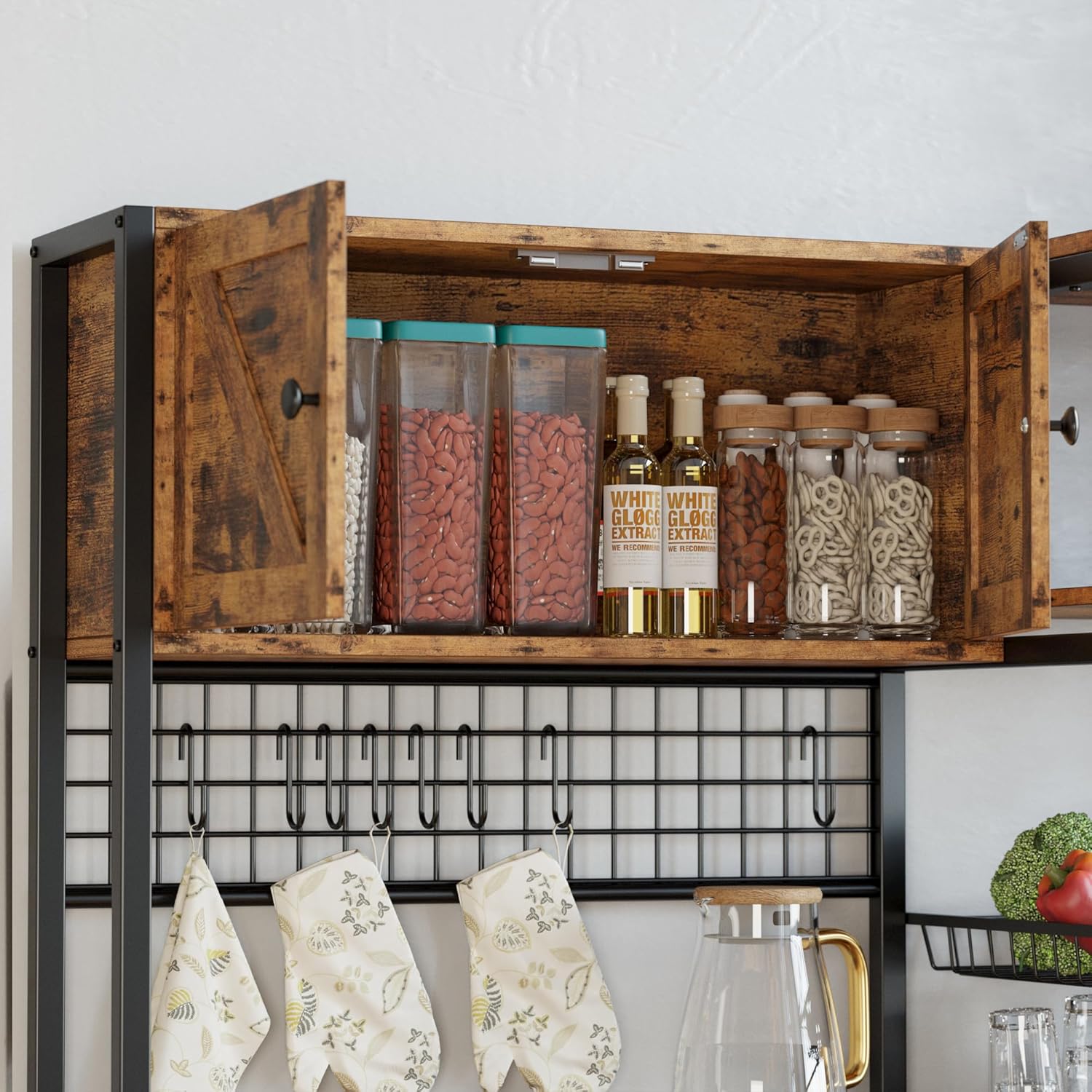 - Spacious Storage Rack: Includes 2 cabinets, open shelves, S hooks, metal grid, goblet holder, and wire basket. Ideal for microwaves, coffee bars, bakers, spices, and office storage.