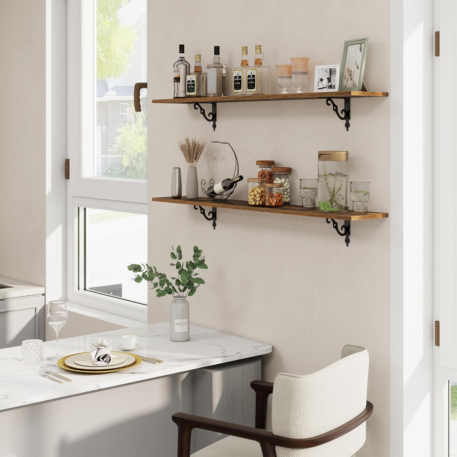 - Well-designed Floating Shelves: Our rustic deep floating shelves are made of high-quality particle board and sturdy brackets. The classic S-shaped metal brackets are designed to prevent sagging and ensure long-lasting stability. All edges are carefully sanded for a smooth finish