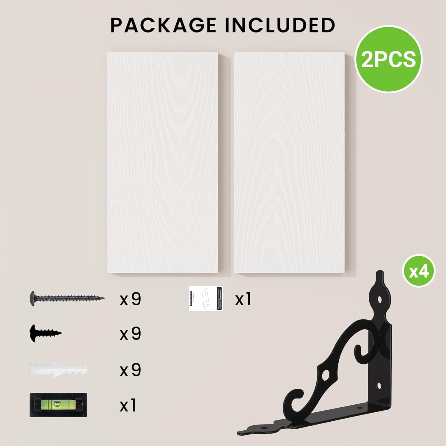 RICHFOCUS Floating Shelves for Wall Decor, 8 Inch Deep Wall Shelves Set of 2, 16W x 8D White Floating Shelves Wall Mounted with Metal Brackets, Rustic Wood Shelves for Living Room Bedroom Kitchen