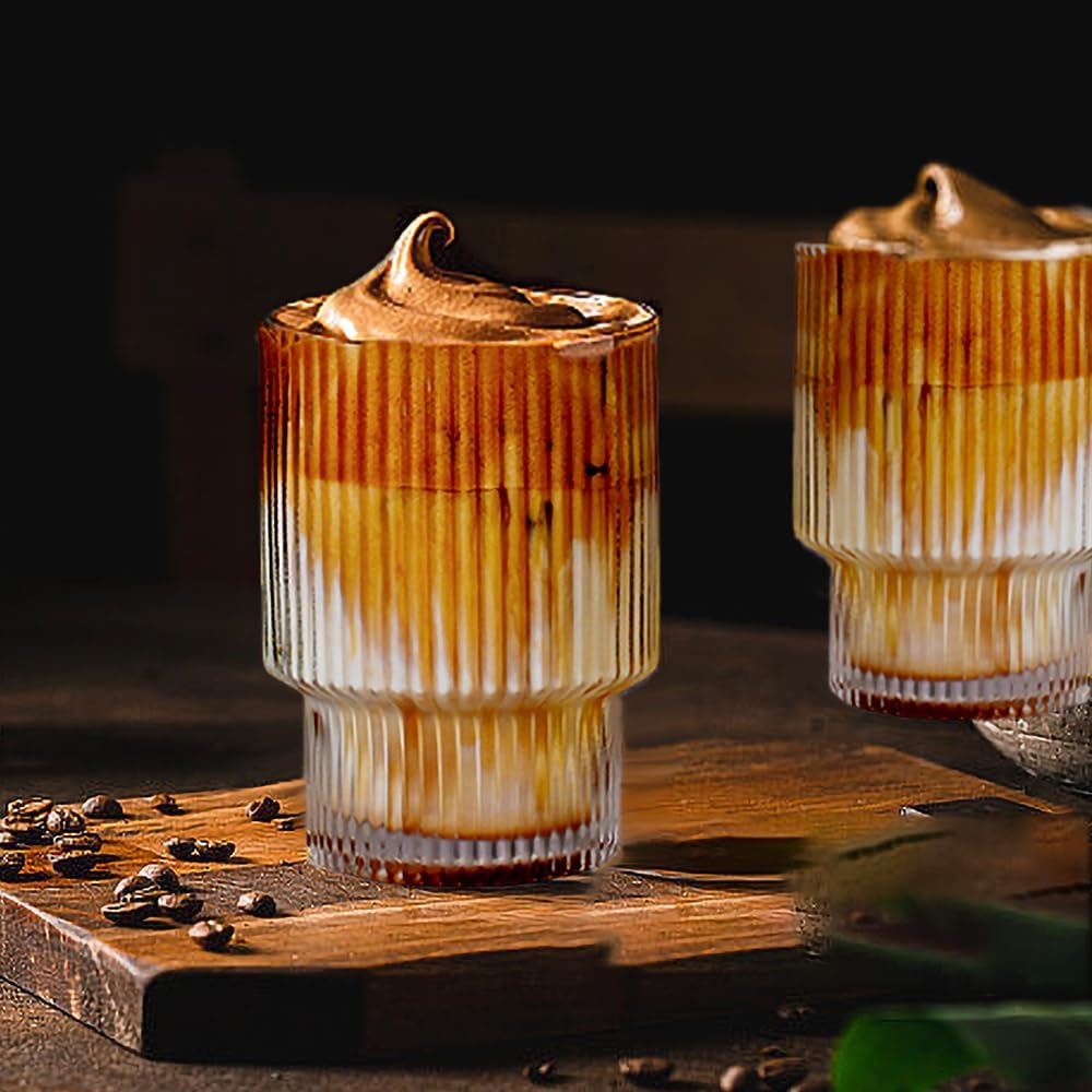 - Stackable Design - This ribbed glass cups features a wide top and narrow bottom that can be easy to be stacked . Each glass can be stacked on top of another glass which is practical and space saving. The glass on all four tumblers is made to be thin, elegant, and strong.