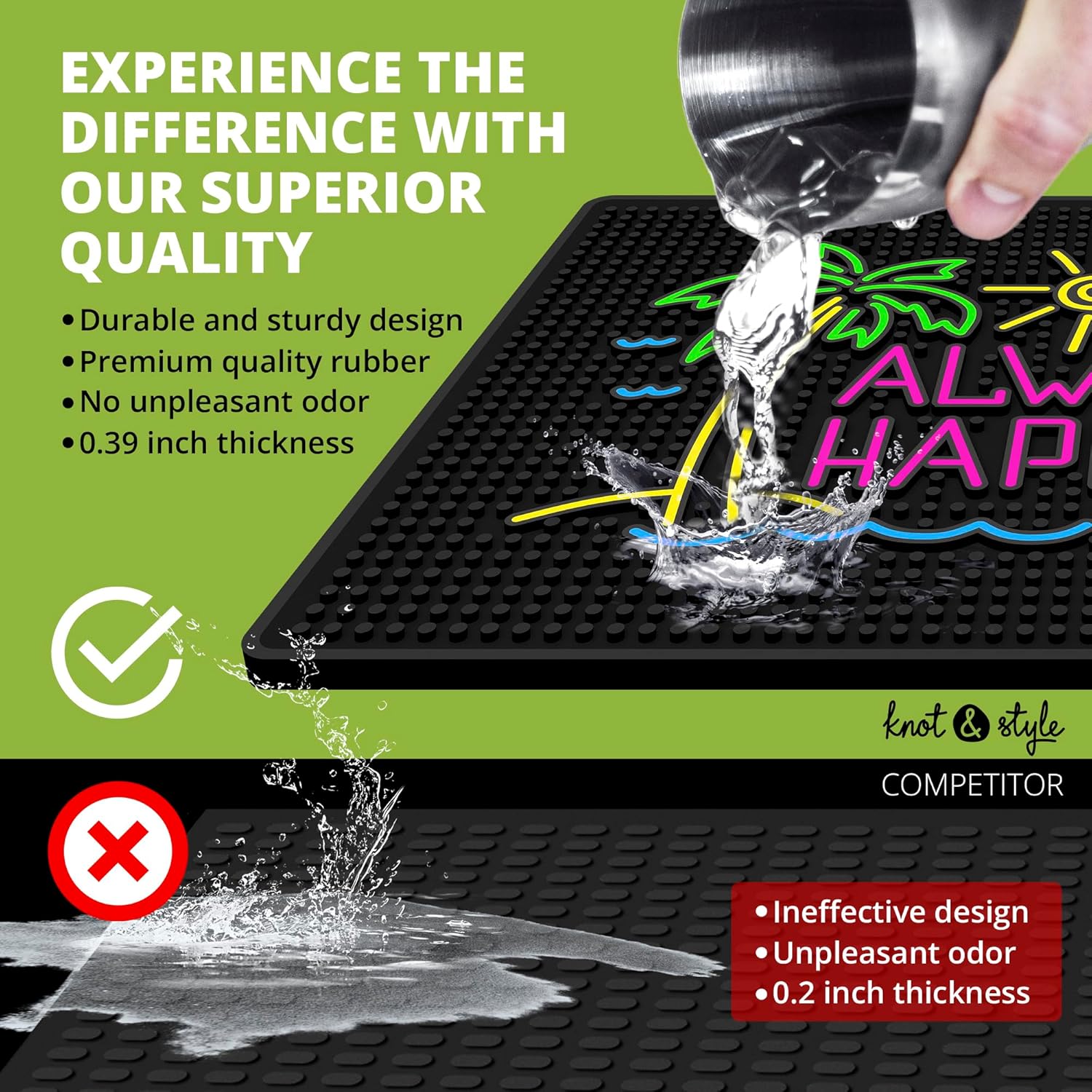 - PREMIUM QUALITY & DURABILITY Crafted from high-grade materials, this 18x12 bar mat ensures long-lasting use, with a non-slip surface that keeps your bartending essentials secure. Designed for cocktail enthusiasts and home entertainers, it's perfect for both indoor and outdoor use.