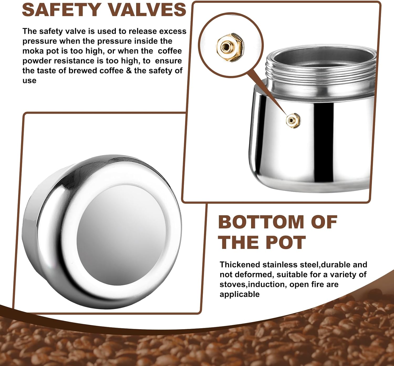 - Stainless Steel Design: The Espresso coffee maker body is polished and designed with smooth stainless steel, with three-ring precision threads, equipped with a high-performance pressure-resistant safety valve, double safety guarantee design, effectively preventing over-pressure situations. The frosted coating inside the moka pot is not made of aluminum, but is treated with a fine sandblasting process, further enhancing the overall texture and durability