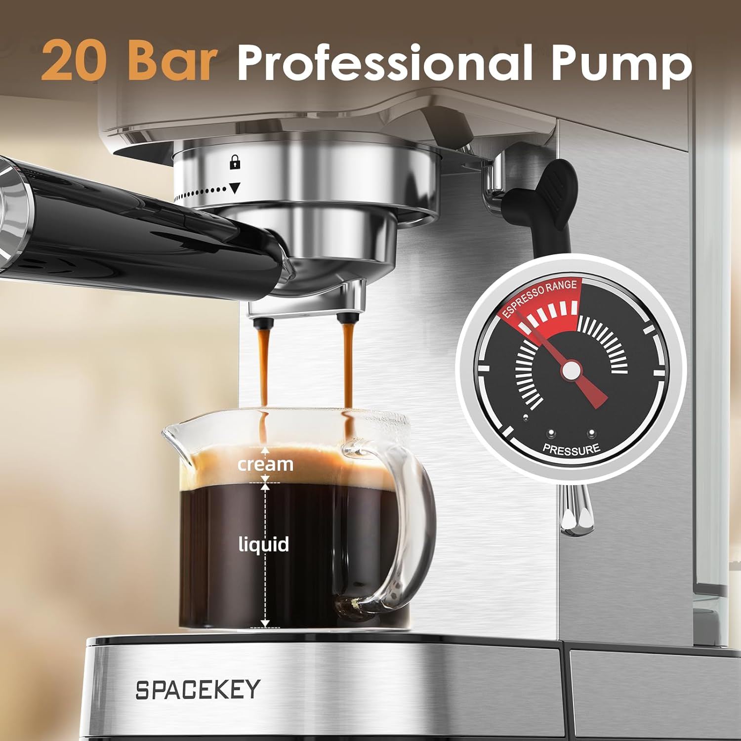 Spacekey Espresso Machine 20 Bar, Professional 1350W Espresso Maker with Milk Frother, Compact Stainless Steel Cappuccino & Latte & Americano Maker with 39oz Removable Water Tank, Silver