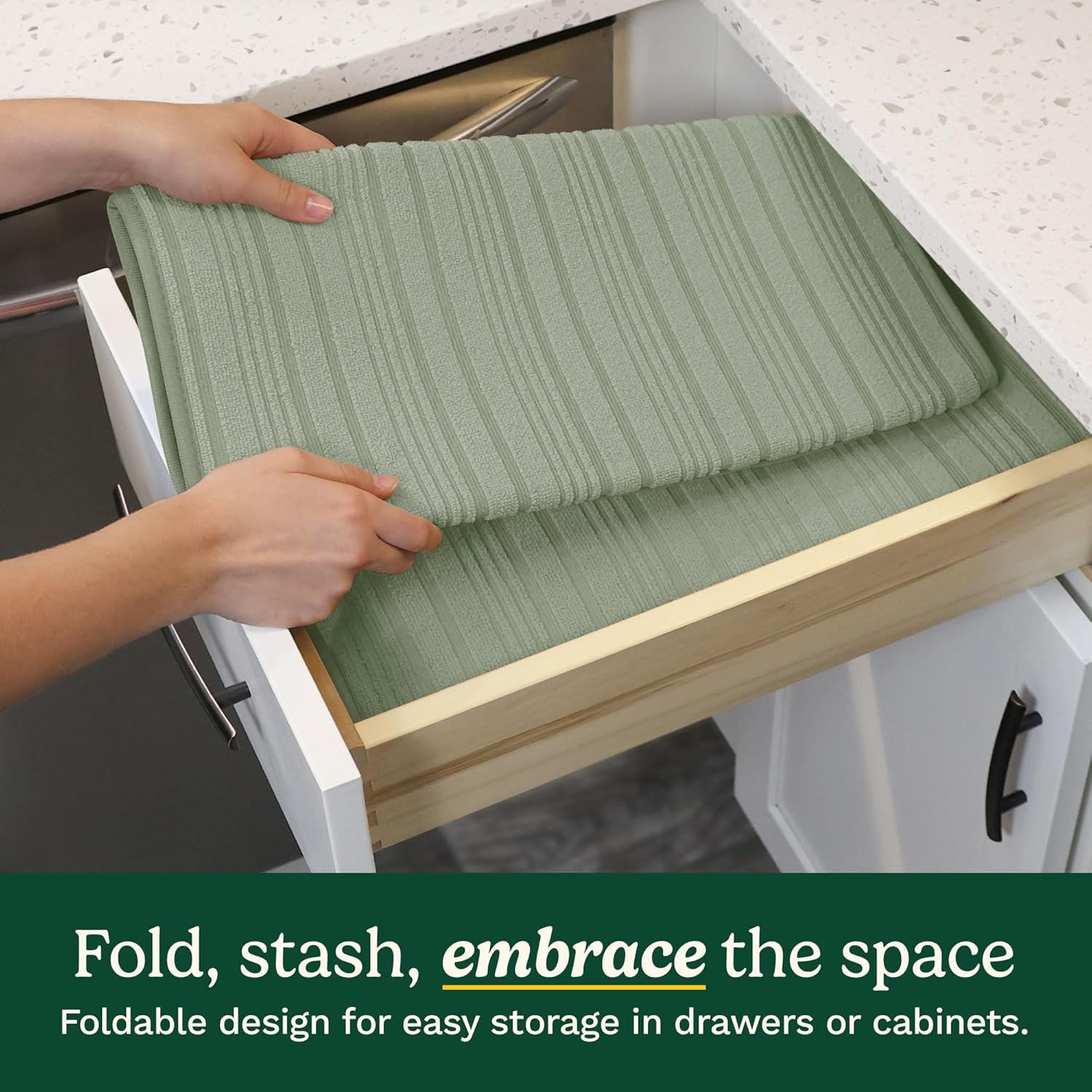 - SLEEK DESIGN, EASY STORAGE – Foldable for easy storage in drawers or cabinets, with a hanging loop for convenient alternative storage. These 18” x 24” xl dish drying mats come in stylish patterns, making them the perfect kitchen accessories for countertops while saving space at the same time.