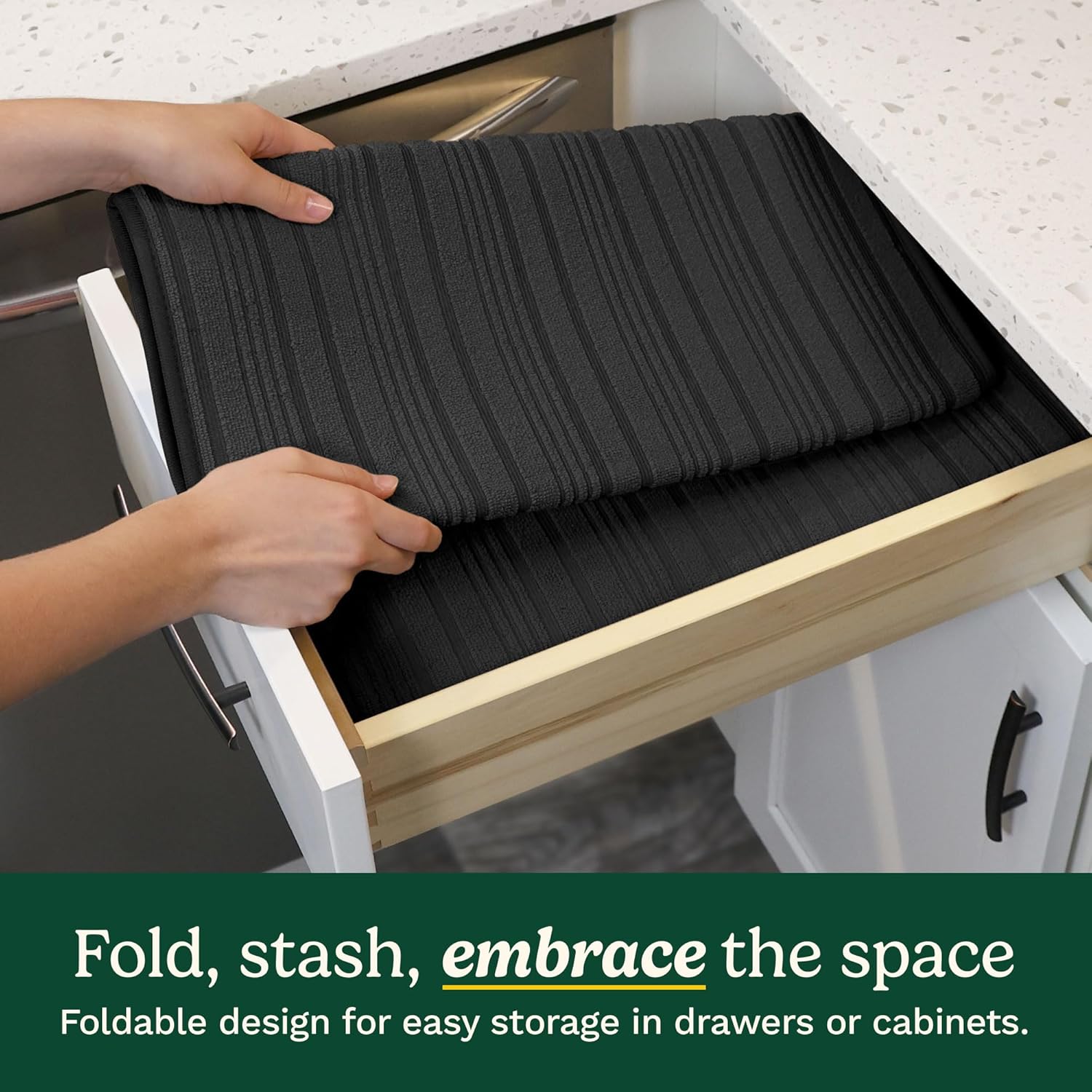 - SLEEK DESIGN, EASY STORAGE – Foldable for easy storage in drawers or cabinets, with a hanging loop for convenient alternative storage. These 18” x 24” xl dish drying mats come in stylish patterns, making them the perfect kitchen accessories for countertops while saving space at the same time.