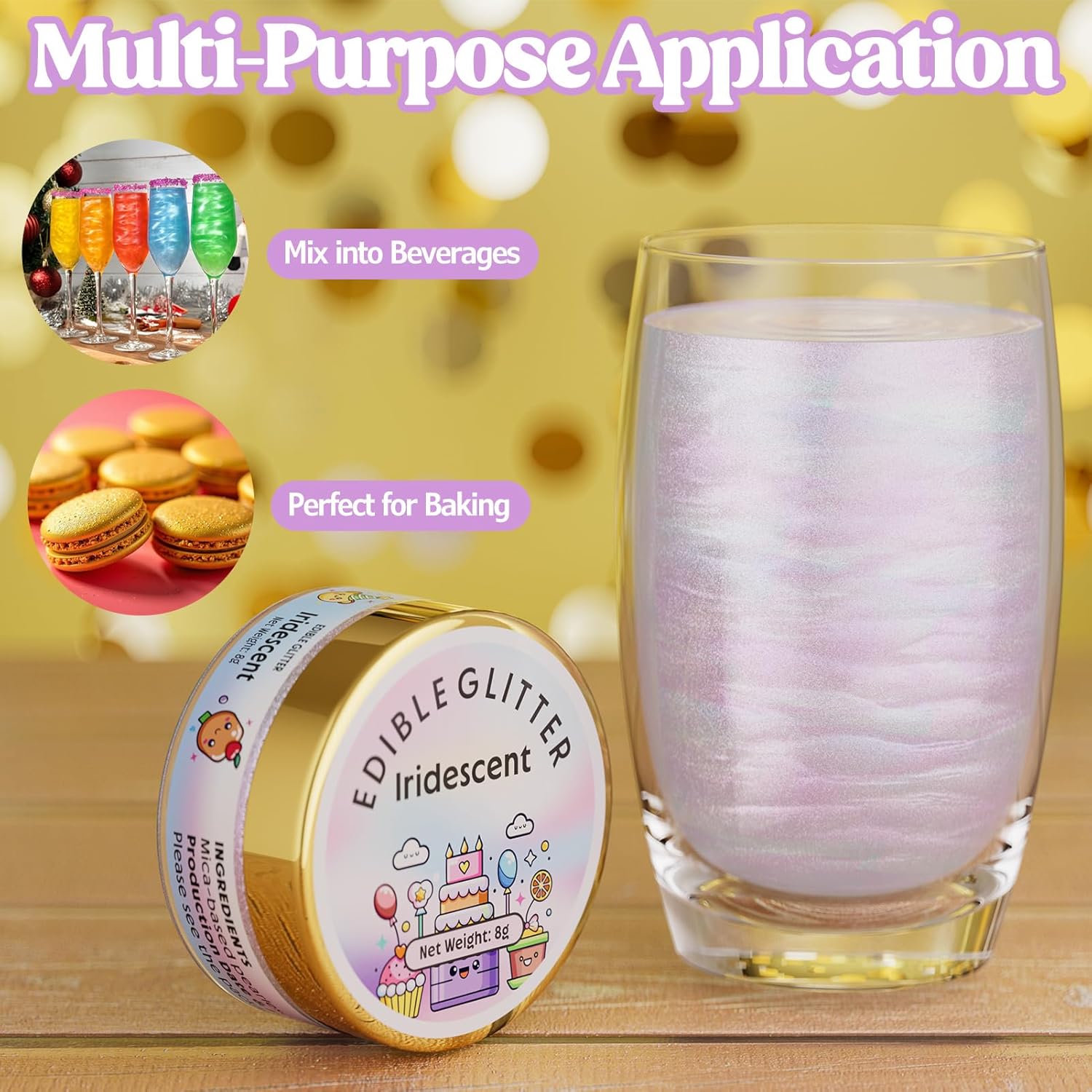 - Widely Used - This edible glitter is perfect for DIY wine, cocktails, champagne, drinks, beer, soda and more. it also can be sprinkled directly on the food, used to decorate cakes, cookies, chocolates, macarons, fruit platters, cupcakes, strawberries, lollipops, ice cream and more. It is also a great decoration for christmas, easter, halloween, thanksgiving, birthdays or any memorable holiday