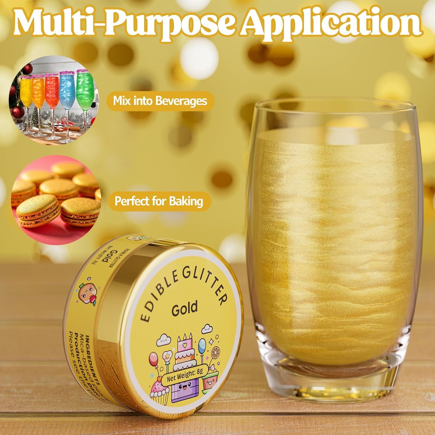 - Widely Used - This edible glitter is perfect for DIY wine, cocktails, champagne, drinks, beer, soda and more. it also can be sprinkled directly on the food, used to decorate cakes, cookies, chocolates, macarons, fruit platters, cupcakes, strawberries, lollipops, ice cream and more. It is also a great decoration for christmas, easter, halloween, thanksgiving, birthdays or any memorable holiday