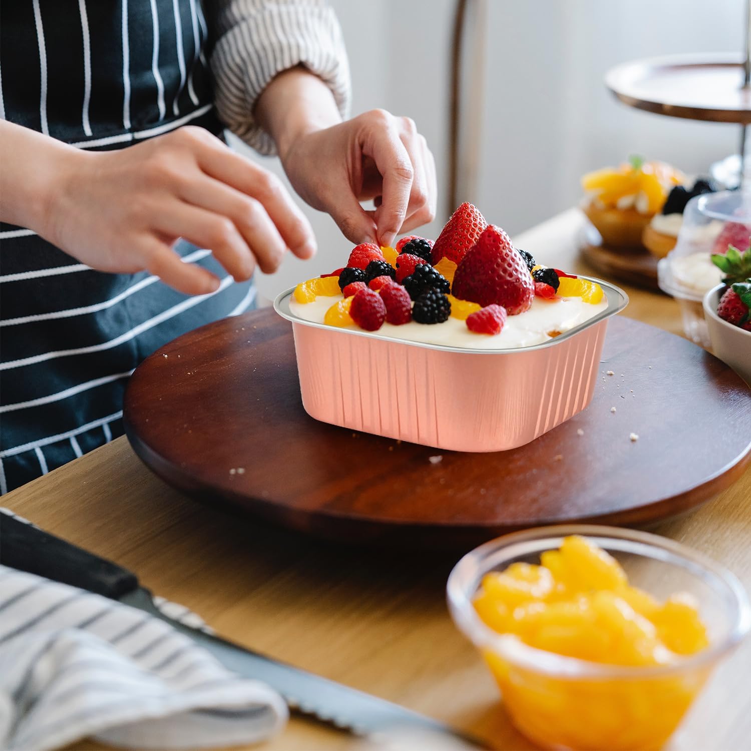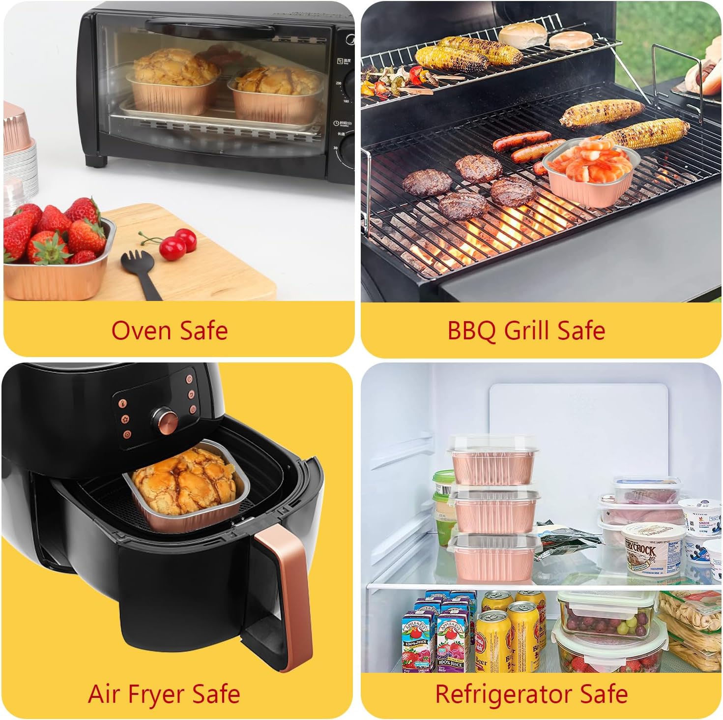 - 【No Baking Tray Needed】-These disposable mini pans are made of thicken food-grade aluminum foil,can stand well in oven.The mini cake tins are oven ,BBQ grill and air fryer safe.These mini aluminum baking pans can withstand temperatures up to 250℃/482℉,please allow cups to cool prior to applying lids. (NOTE:The clear lids are not heat resistant!)