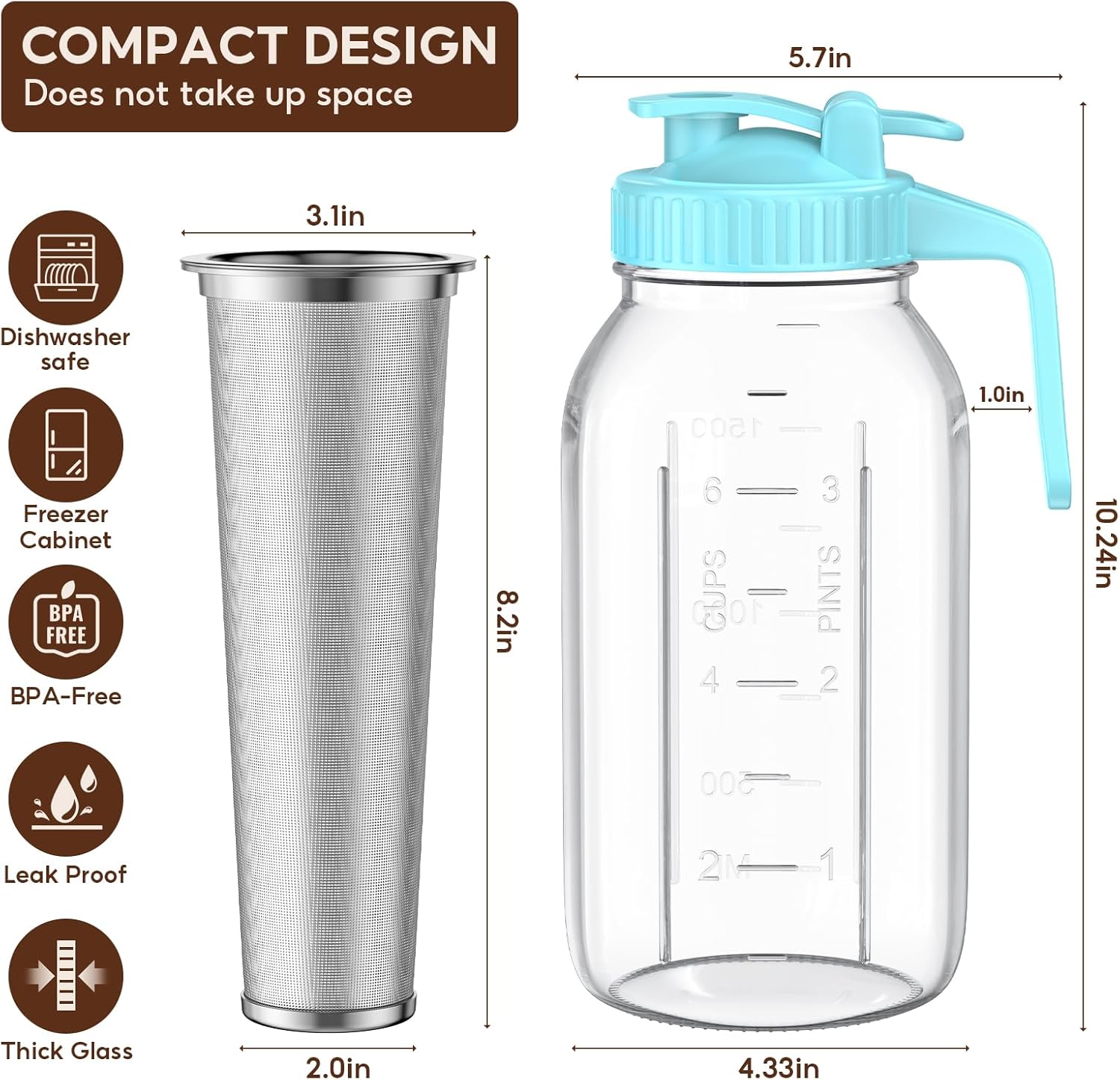 - User-Friendly Design for Everyday Use:Every detail of our cold brew coffee maker is designed with you in mind. Made from heavy-duty, food-grade soda-lime glass and a BPA-free premium plastic lid, it’s safe and durable. The thick glass is resistant to breakage, and the ergonomic handle ensures a comfortable, spill-free pour. Whether you're brewing for yourself or guests, this cold brew pitcher makes the process seamless and enjoyable