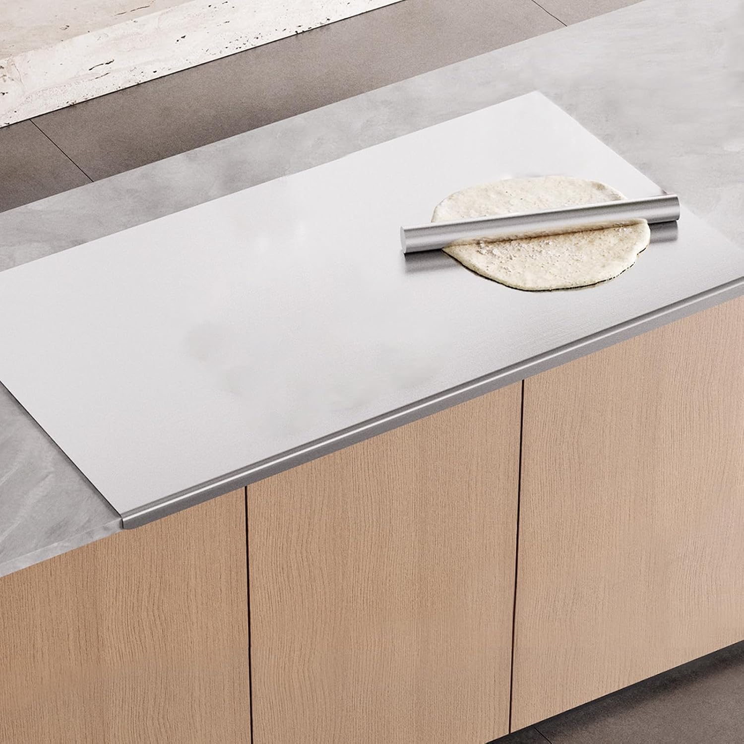 - STAINLESS STEEL MATERIAL: This large chopping board with a rolling pin are completely made of high quality and fine 304 stainless steel material.The baking board can be used on both sides and will withstand long hours of use in the kitchen without damage