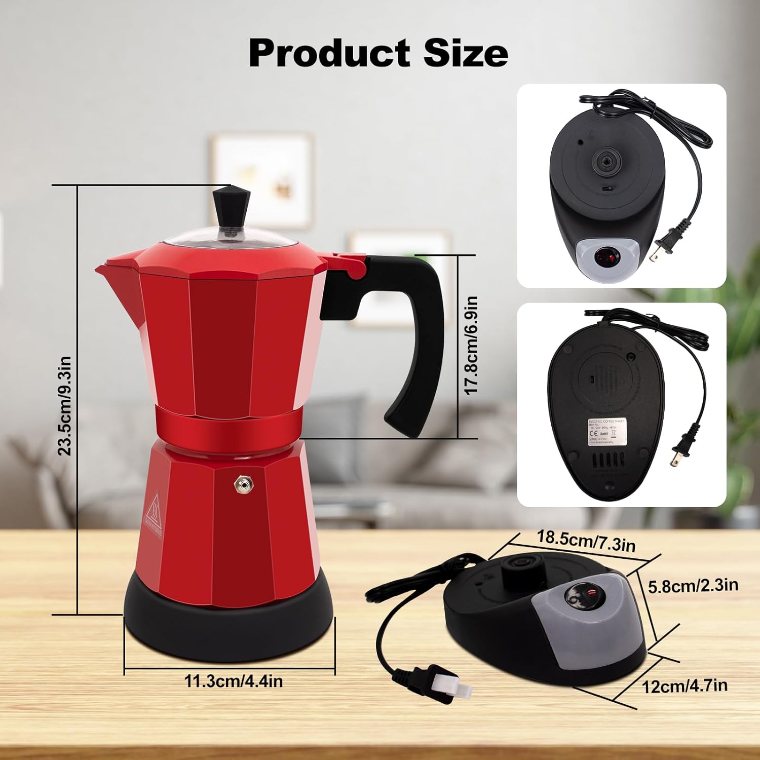 Electric Aluminum Moka Pot 5-6 Cup 270ml Espresso Maker with Detachable Base Ideal Coffee Makers for Home MochaPot Italian and Cuban Café Coffeemaker Espressomaker CoffeePot Red