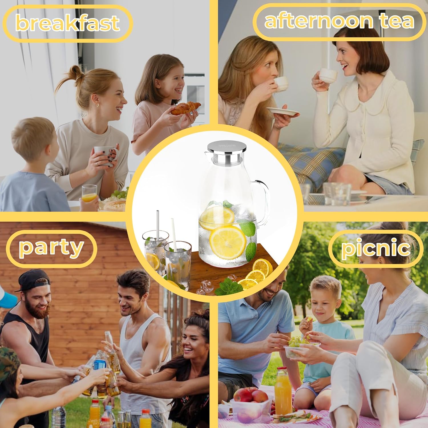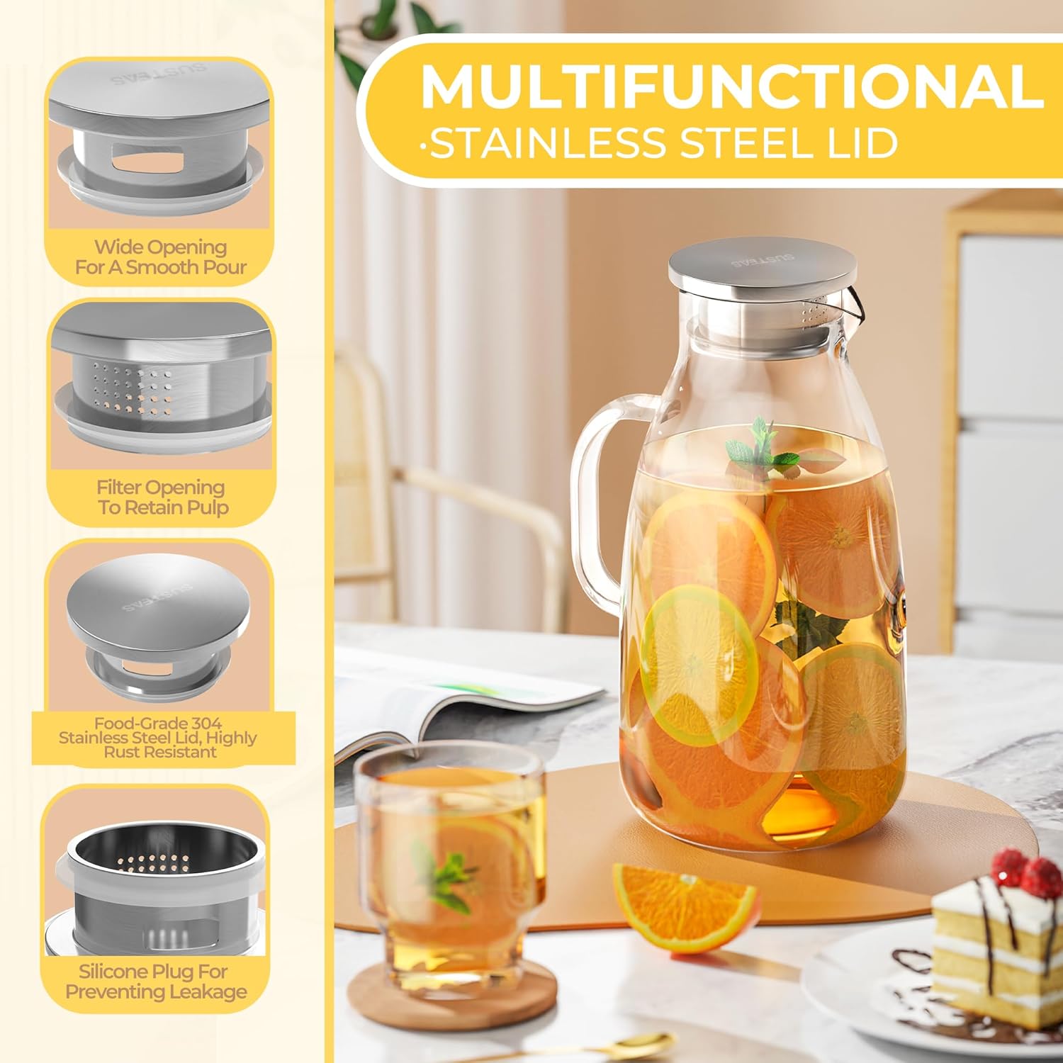 - Perfect Balance Of Design And Utility: Designed to provide a pleasurable drinking experience, this glass kettle comes with a double-opening 304 stainless steel that can be adjusted to suit your needs, with two outlets, one for quick pouring and the other for straining, making it easy to retain pulp and ice cubes or to quickly pour a drink. We enlarged the handle as much as possible to provide a comfortable grip, ease of use and elegant pouring