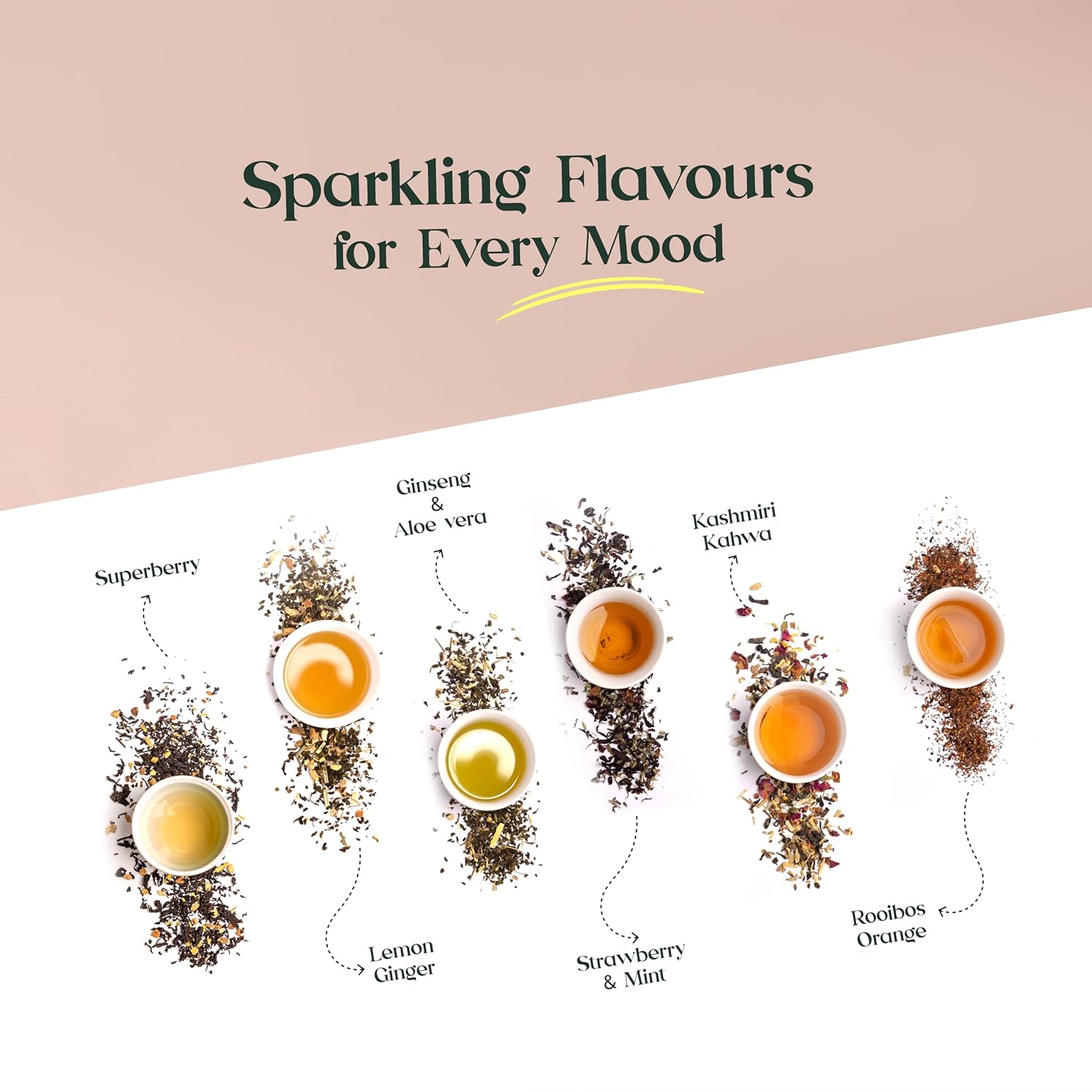 - SIX EXQUISITE FLAVOURS, ONE PERFECT GIFT: Treat yourself and loved ones to a luxurious tea collection featuring zesty Lemon Ginger, antioxidant-rich Superberry, fruity Rooibos Orange & Strawberry mint, spicy Kashmiri Kahwa and Ginseng & Aloe vera– all carefully curated for a refreshing and rejuvenating experience.