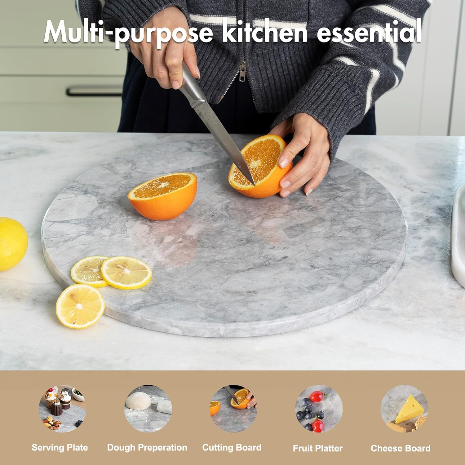 Koville Grayish White Marble Cutting Board Round, 16" Marble Cheese Board for Kitchen - Non-Stick Heat Resistant Stone Cutting Boards for Baking, Charcuterie, Pastry, Trivet