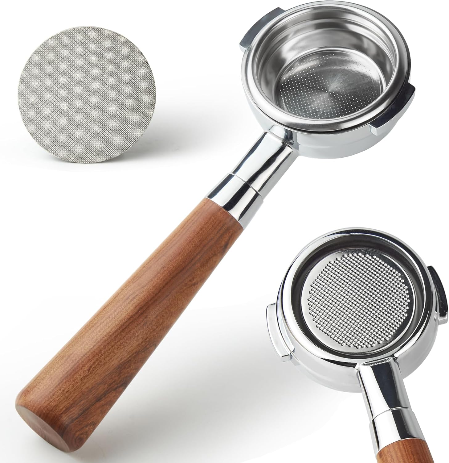 - Crafted with Food-Grade Stainless Steel and Natural Rosewood Handle: The portafilter head is cast in food-grade stainless steel and highly polished by manual craftsmanship to ensure a snug fit with the coffee machine. The portafilter handle is made of natural rosewood, providing a smooth surface and ergonomic design for a comfortable and natural grip