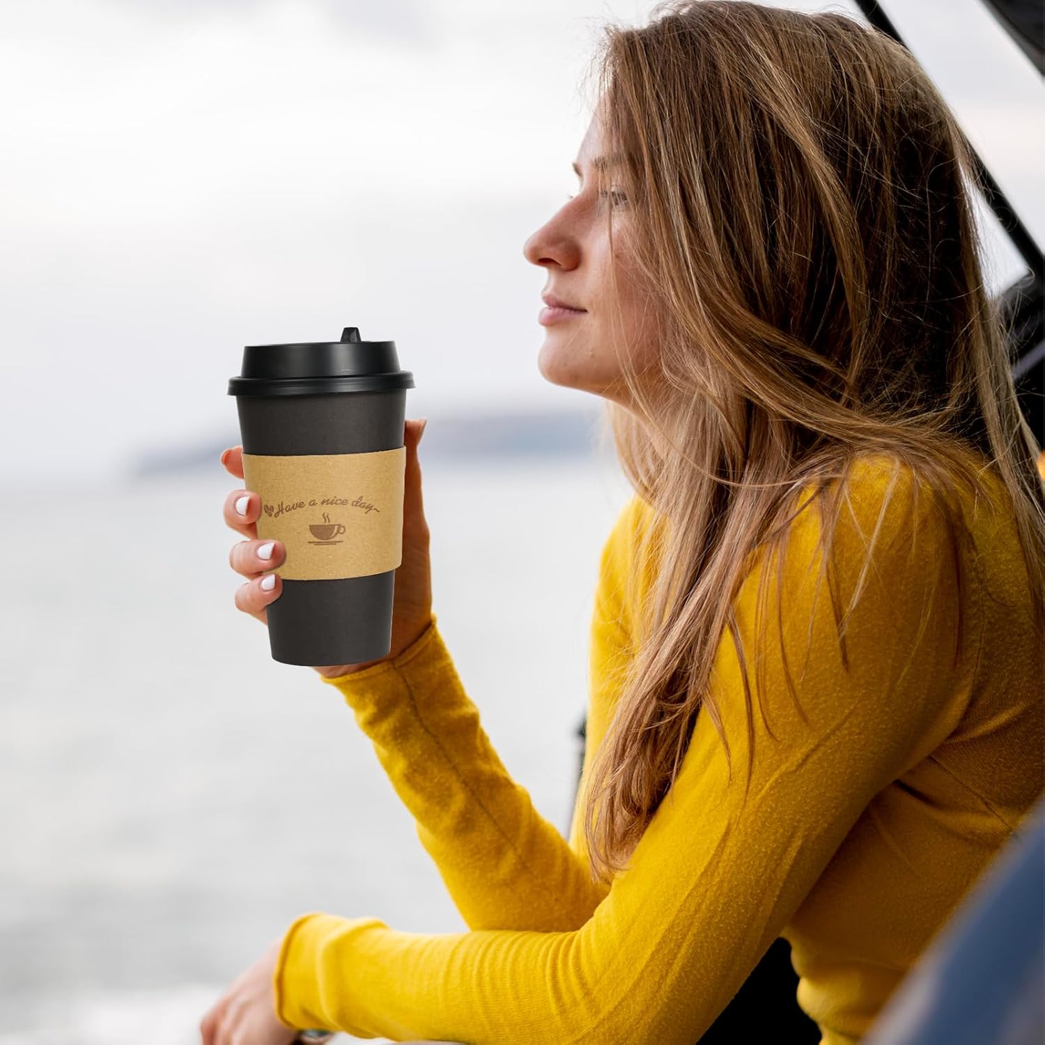 - Packaging: You will receive 500 packs of 16 oz coffee cup sets, including 500 packs of black paper coffee cups, 500 packs of plastic lids, 500 packs of kraft paper cup sleeves, and 500 packs of straws