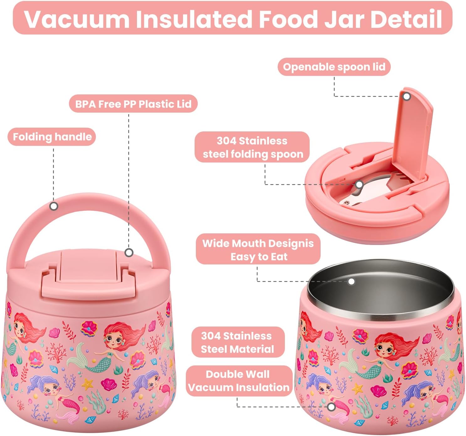 14oz Insulated Vacuum Food Jar with Buckle Lid,Soup Thermo for Hot Food Kids,Wide Mouth Leakproof Stainless Steel Lunch Container with Spoon-Mermaid