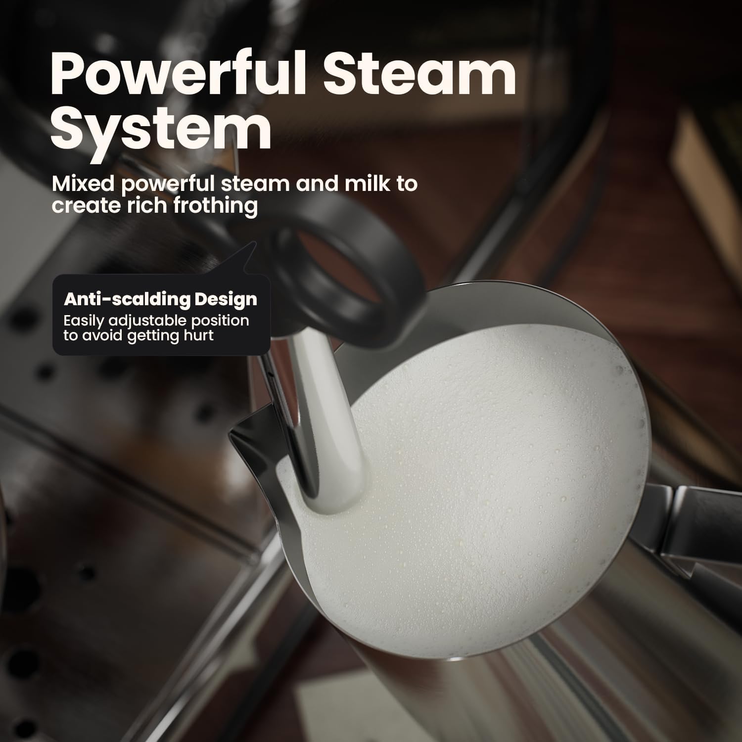 - 【Milk Frothing System】Our coffee makers with milk frothers are equipped with a powerful steam wand that allows you to create delicate & rich aromas, achieve stunning milk foam art, and enhance the flavor of your coffee. Easily adjust the stainless steel steam wand using the side button to create silky smooth milk froth.