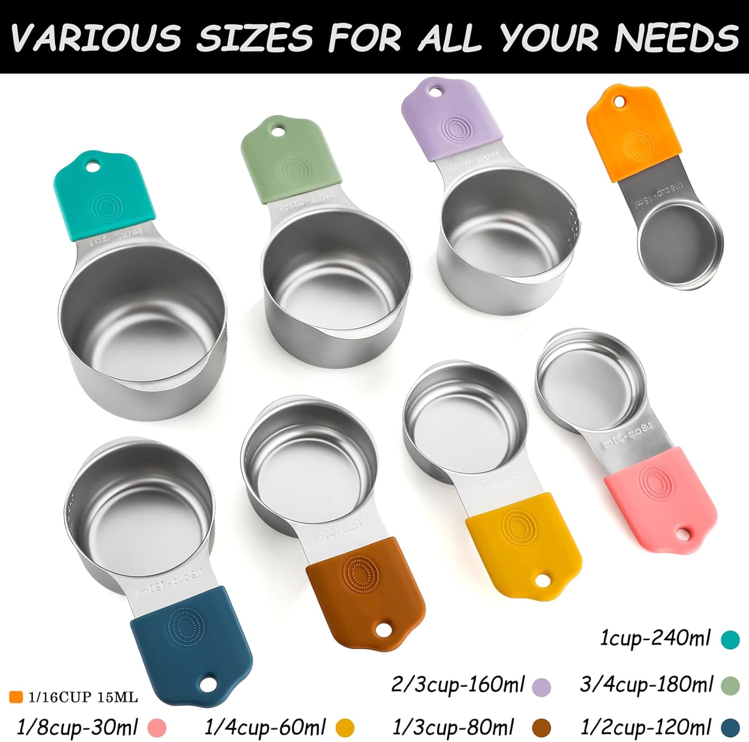 - 【Magnetic Measuring Cups Set】The size of the magnetic stainless steel measuring cup set includes 1/16 cup, 1/8 cup, 1/4 cup, 1/3 cup, 1/2 cup, 2/3 cup, 3/4 cup, and 1 cup. Seven different sizes are used for cooking or baking.