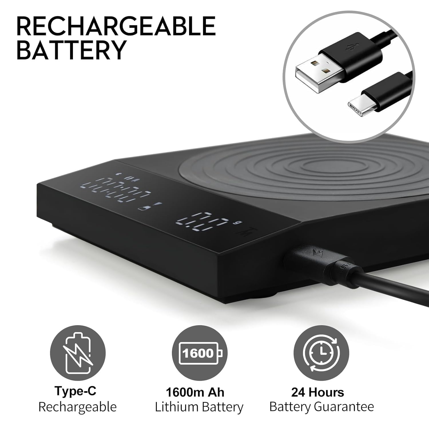 Rechargeable Mini Coffee Scale with Timer,FSJCOFFEE Espresso Scale Metal Body 2kg/0.1g Precision Coffee Scale, for Pour-Over Coffee,Portable Digital Kitchen Scale, Food Scale with Auto Timer (Black)
