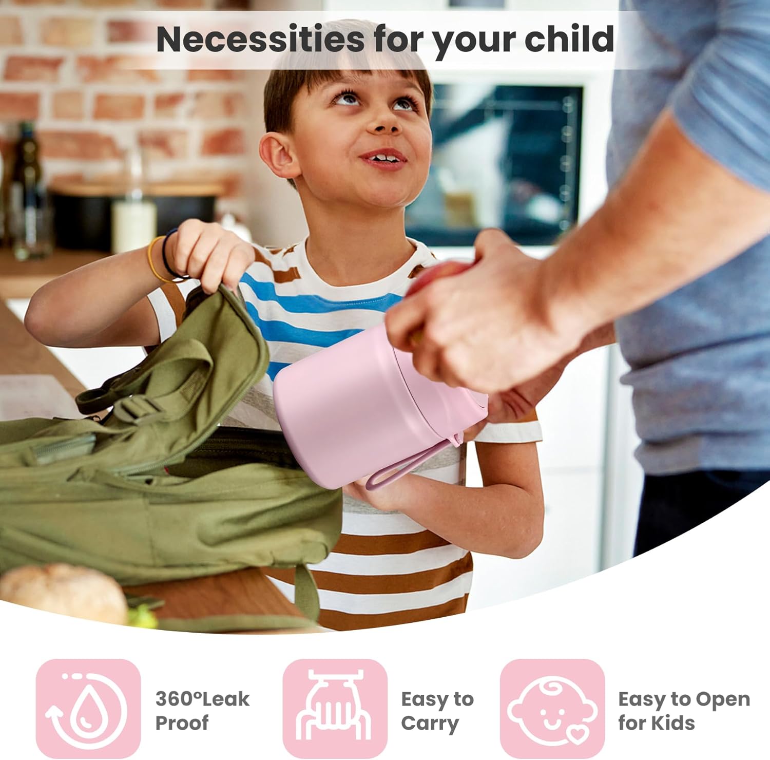 - Leak-Proof Design: Featuring an upgraded double-layer silicone seal that provides a 360° leak-proof guarantee. Rest assured that our leak-proof thermo food jar can fit in your lunch bag without worrying about spills. The insulated thermal food jar comes with a stainless steel spoon for your child's convenience.