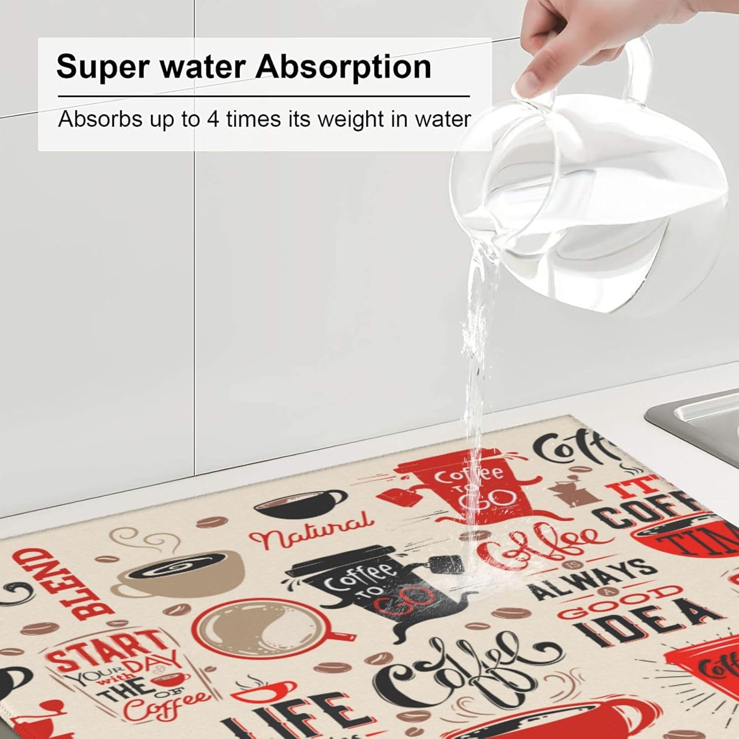 Coffee Themed Dish Drying Mat, Highly Absorbent Microfiber Kitchen Counter Pad Reusable Washable, 16*18"