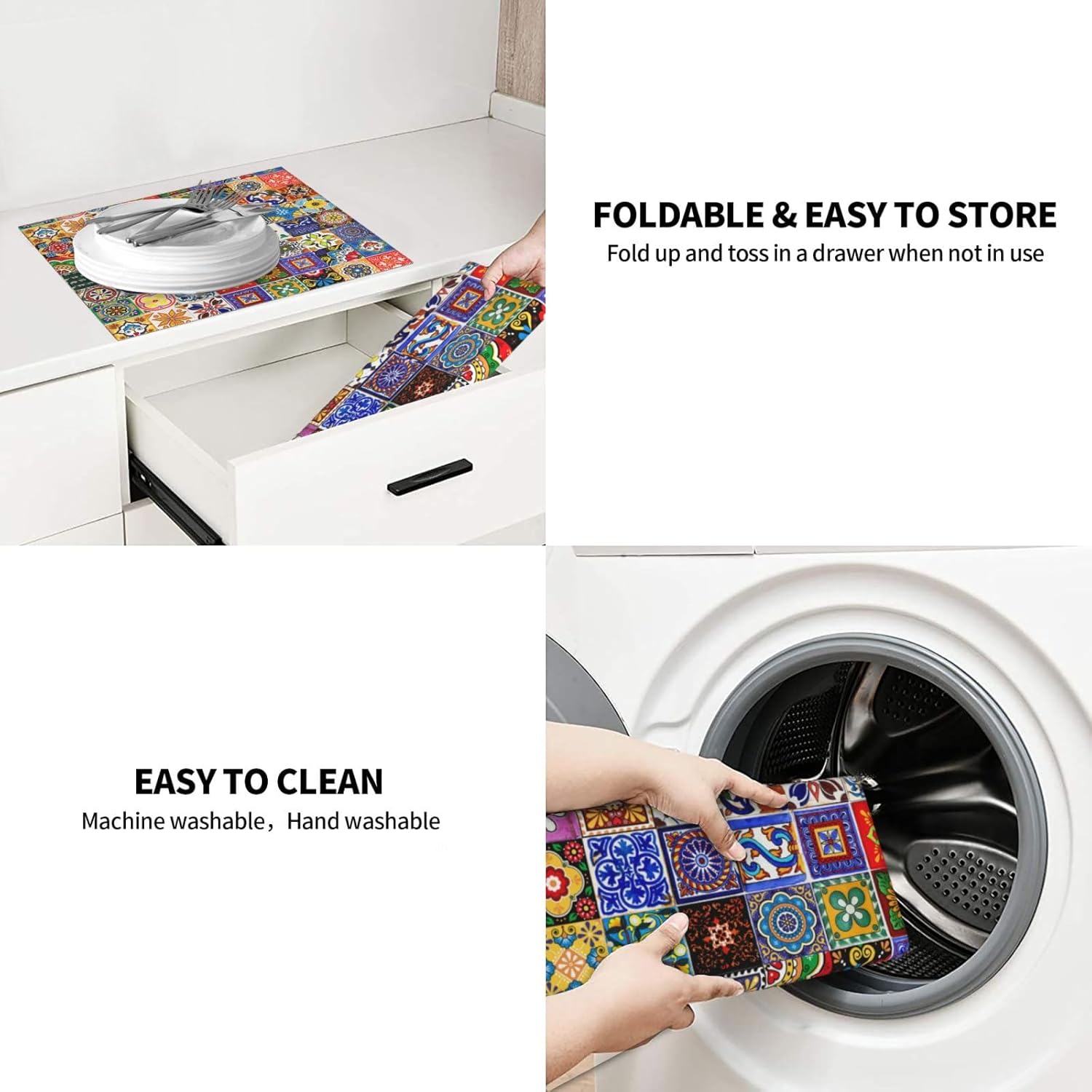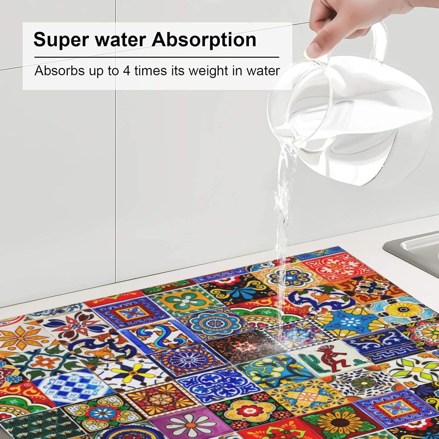 Bohemian Chic Floral Dish Drying Mat, Highly Absorbent Microfiber Kitchen Counter Pad Reusable Washable, 16*18"