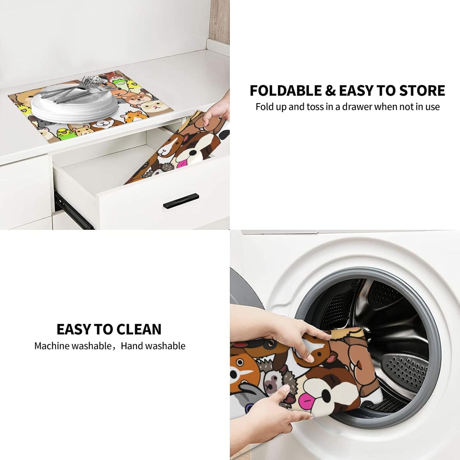 - Easy To Clean & Store -- The Drying Mat Is Machine Washable, Easy To Clean And Store. Fold And Slip Into A Drawer Or Cabinet When Not In Use. The Mat Can Also Be Hung On The Hook With The Tape