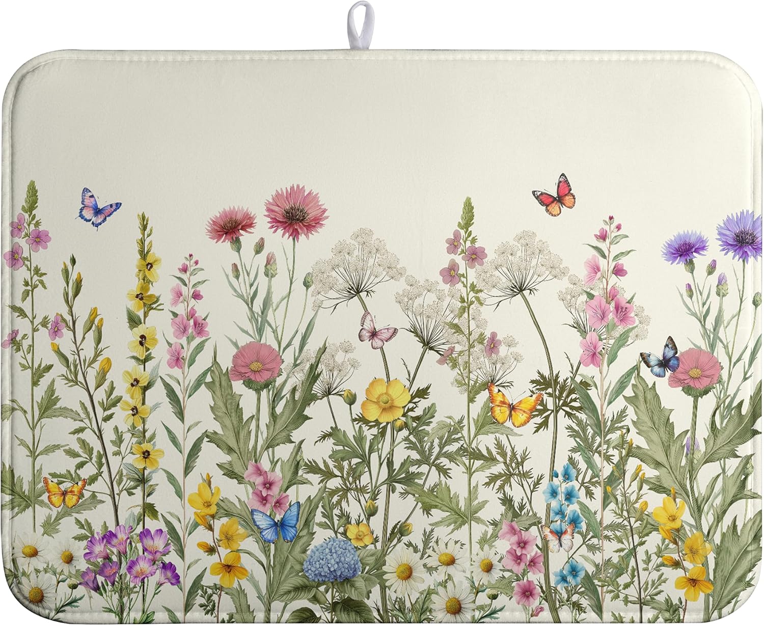 - [Space Saving]: This Spring Summer dish drying mats for kitchen counter Flowers dish drying mat floral lightweight absorbent dish drying mat has a webbing lanyard in the middle of the horizontal side for hanging, and Spring Floral Flowers dish drying matt kitchen counter can also be folded and thrown into a drawer or stuffed elsewhere.