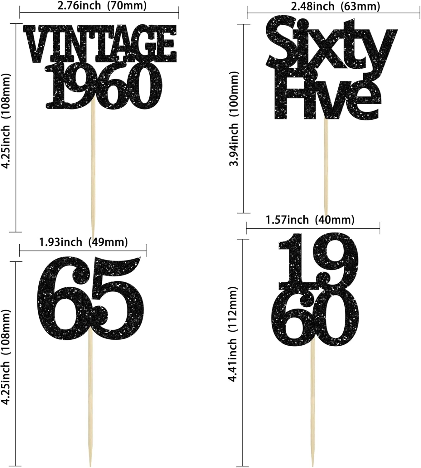 Gyufise 24Pcs Vintage 1960 Cupcake Toppers Glitter Cheers to 65 Fabulous Sixty Five Cupcake Picks 65th Birthday Wedding Anniversary Party Cake Decorations Supplies Black