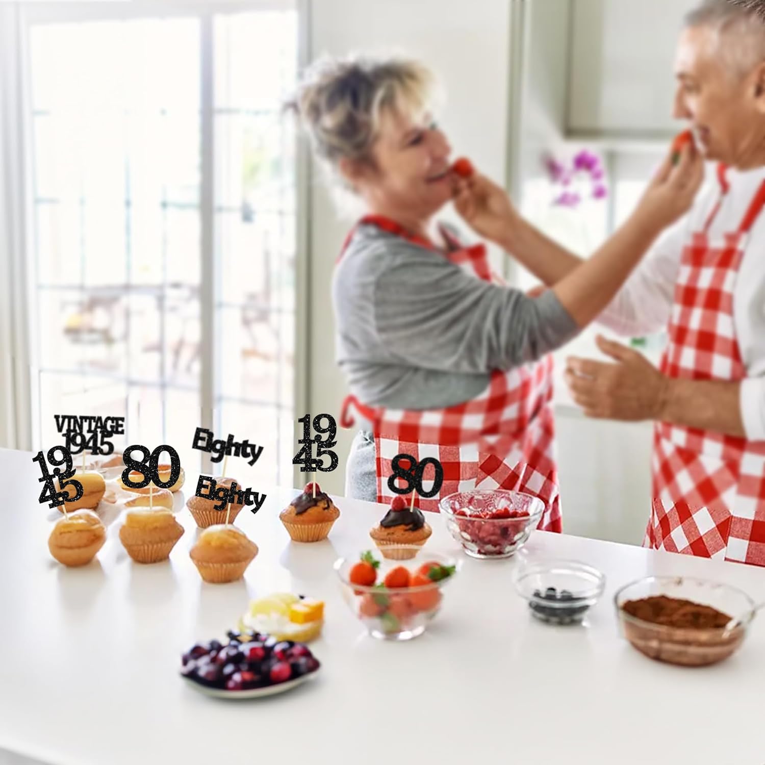Gyufise 24Pcs Vintage 1945 Cupcake Toppers Glitter Cheers to 80 Fabulous Eighty Cupcake Picks 80th Birthday Wedding Anniversary Party Cake Decorations Supplies Black