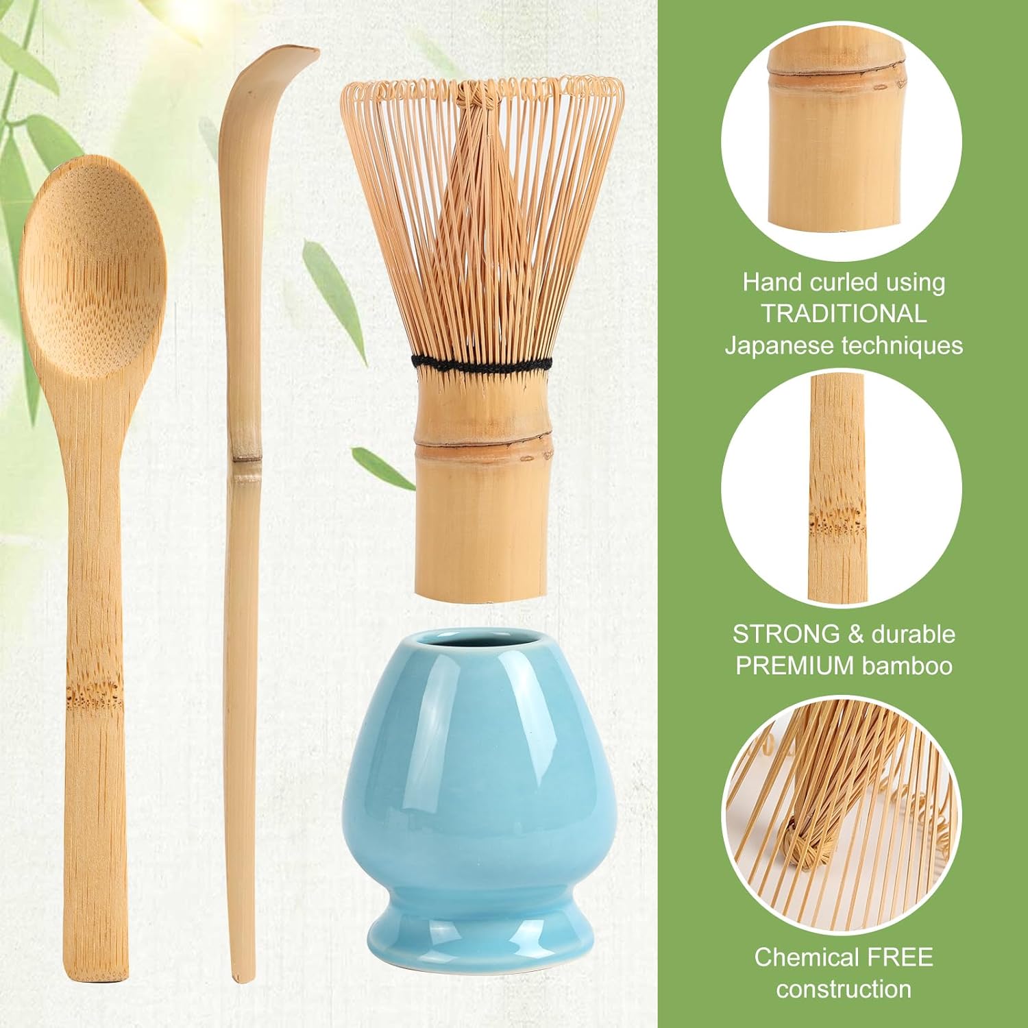 - [Japanese Matcha Whisk Set 4pcs]:This Matcha Set Contains A Handcrafted Bamboo Whisk(Chasen),Wooden Scoop,Matcha Spoon And Ceramic Whisk Holder, Making It An Ideal Matcha Starter Kit For Tea Lovers
