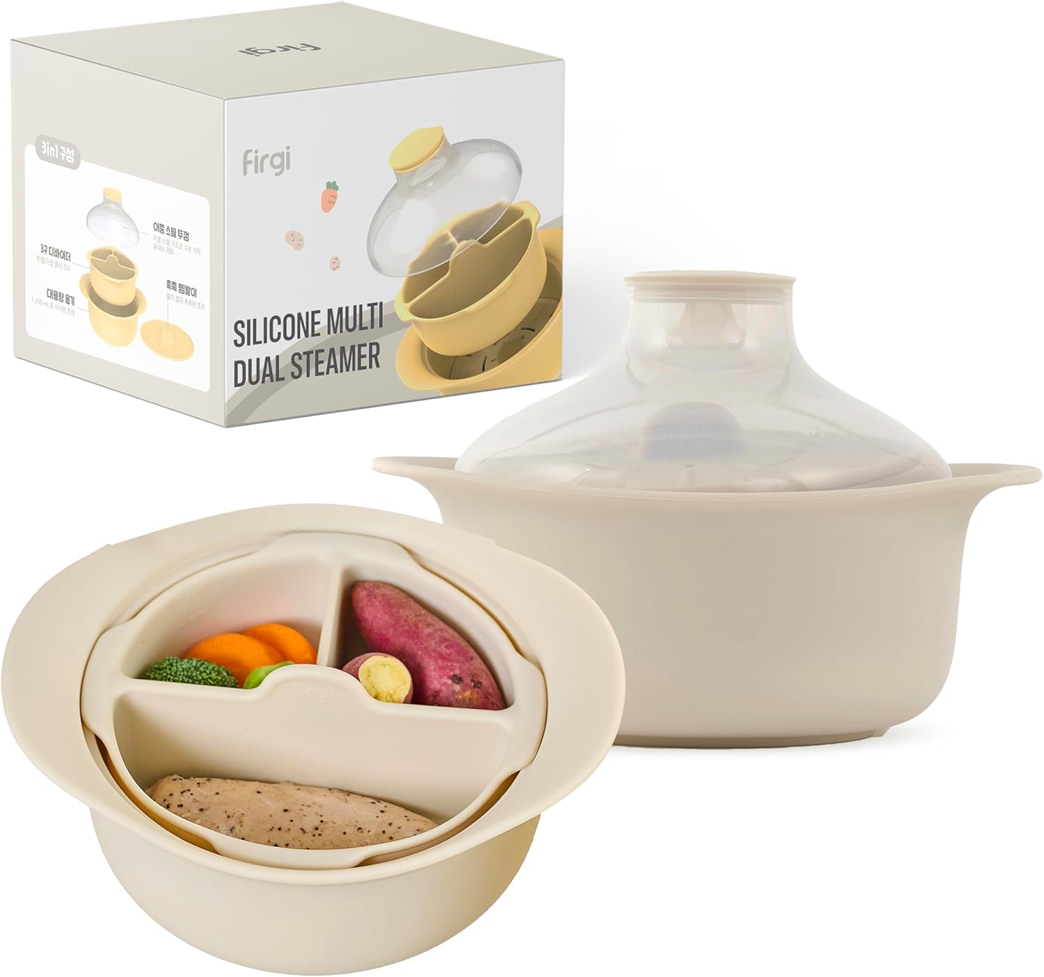 48oz Platinum Silicone 3 Compartmented Microwave Steamer Pot with Handle & Lid - Korea 100% Food-Grade Steamer Bowl, Heat-Resistant Cooker with Steam Holes, Easy Clean, Dishwasher Safe, Ivory