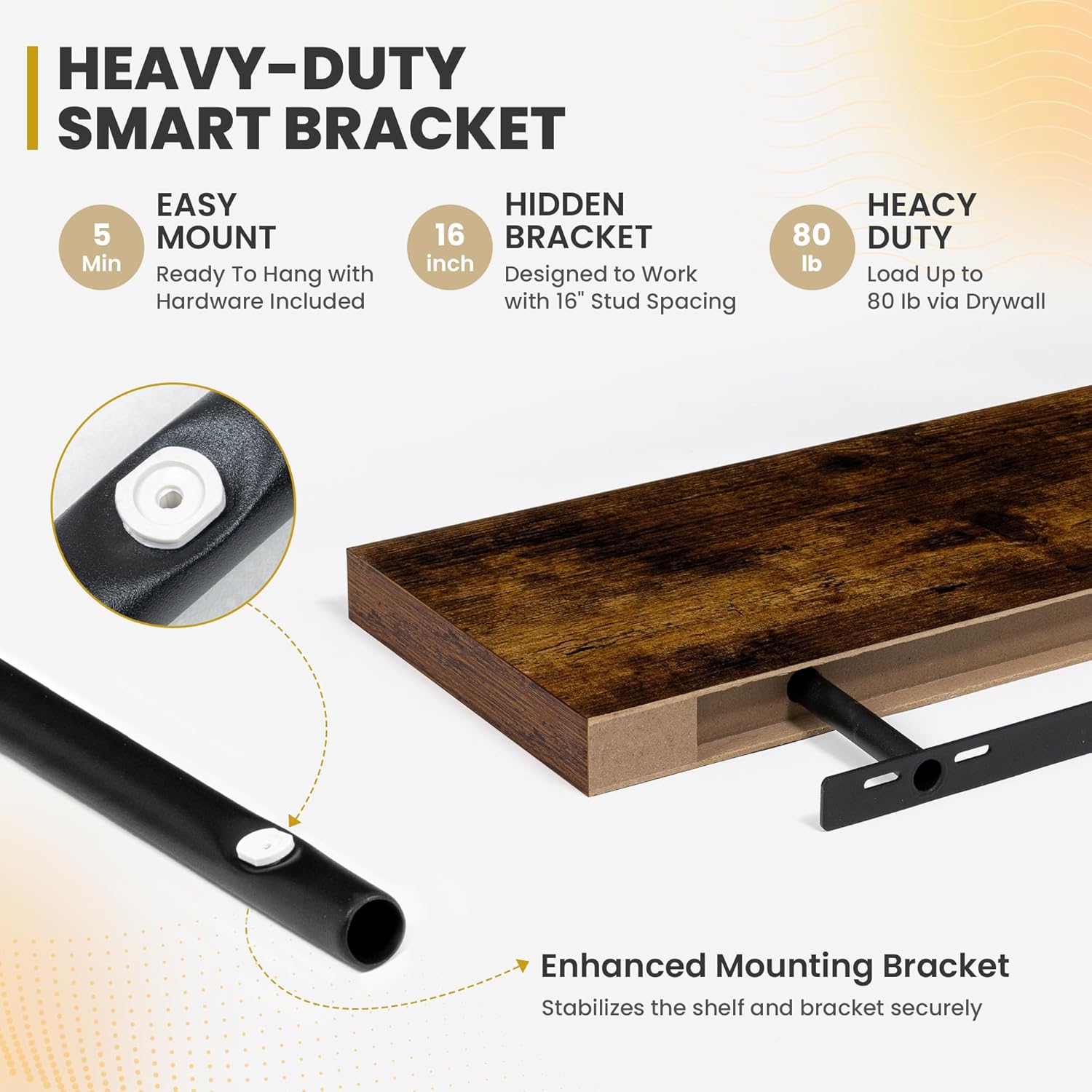 - [ROBUST & SECURE MOUNTING]: Equipped with a sturdy, hidden mounting bracket, these 48-inch floating shelves ensure solid support for your items. Designed for easy and secure installation, they come with all necessary hardware for a firm, wobble-free setup, allowing you to confidently display decor, photos, or functional items with style.
