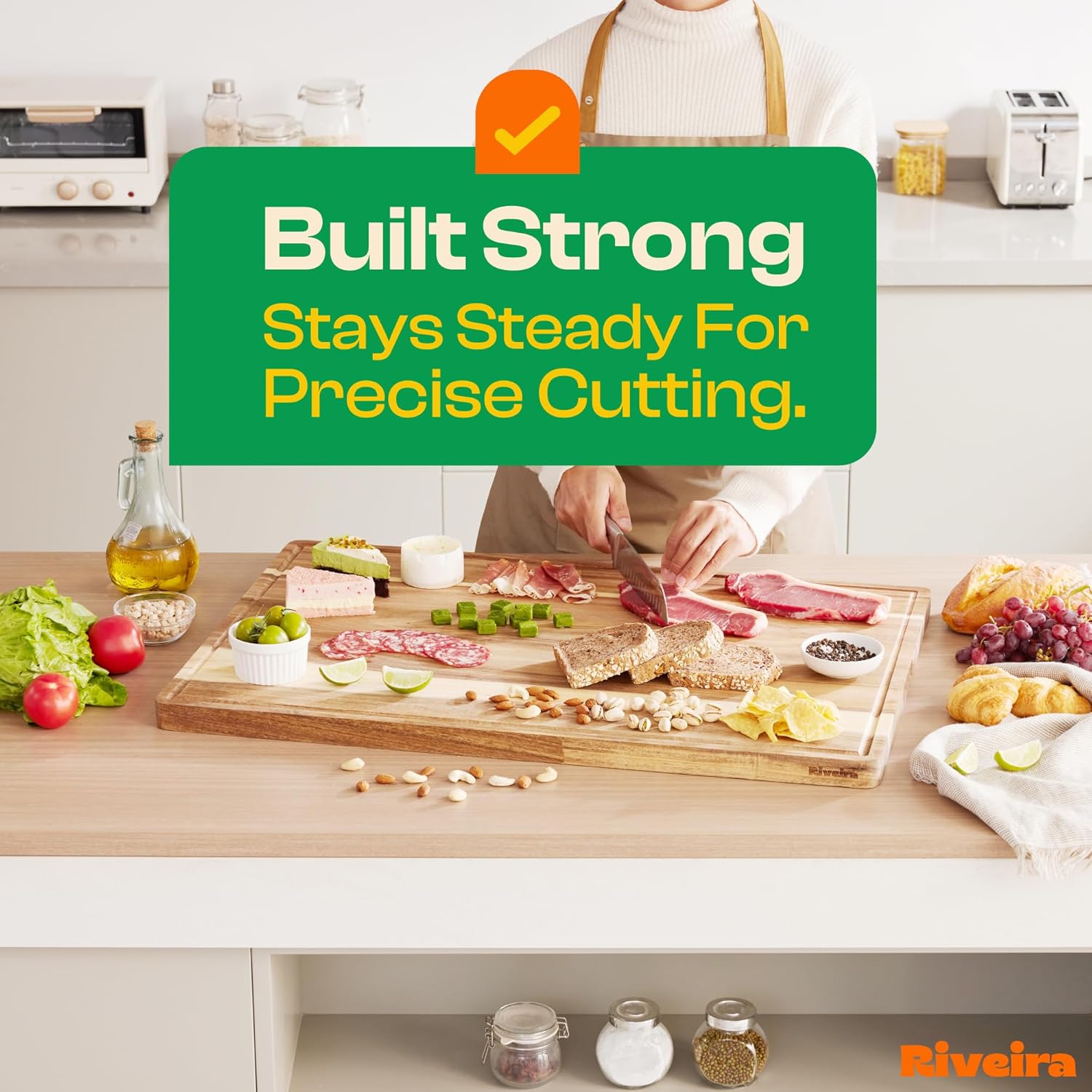 - Premium Crafted Acacia — Take a detour from traditional kitchen aesthetics with this acacia wood board crafted from 100% natural acacia. Beyond being an unconventional and eco-friendly choice, the chopping board wood proudly showcases the environment friendly and organic acacia. This wood cutting boards for kitchen counter adds an unexpected touch of confidence and style to your once-orderly culinary space. Riviera's wooden chopping boards for kitchen will be there for many years to come.