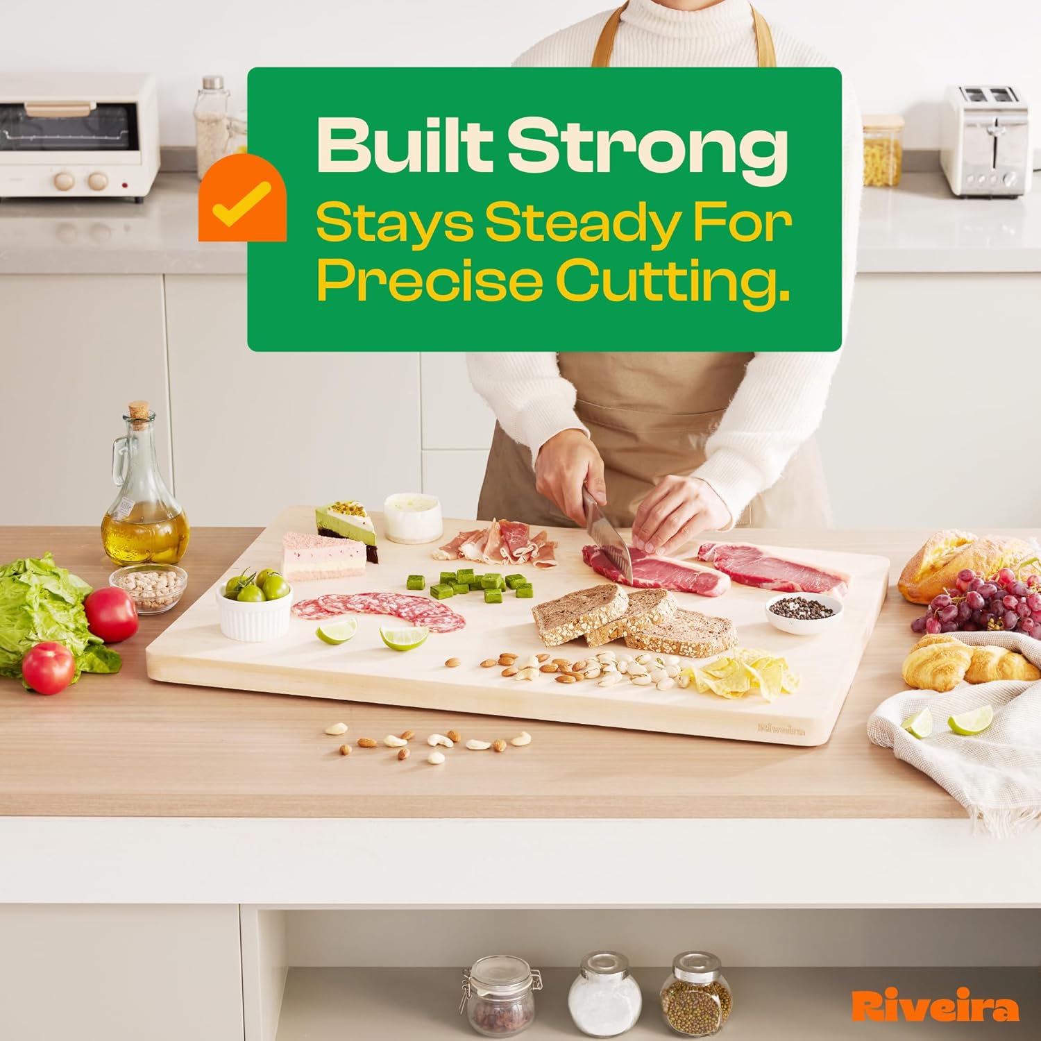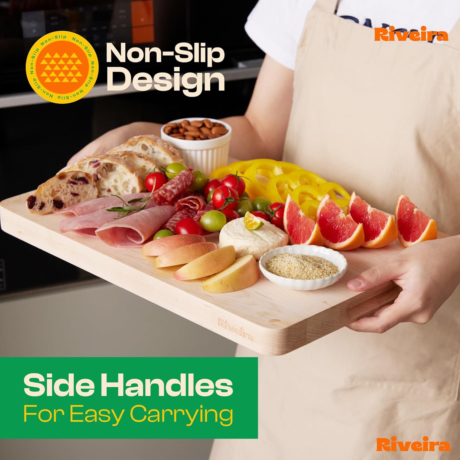- Premium Crafted Maple — Take a detour from traditional kitchen aesthetics with this maple wood board crafted from 100% natural maple. Beyond being an unconventional and eco-friendly choice, the chopping board wood proudly showcases the environment friendly and organic maple. This wood cutting boards for kitchen counter adds an unexpected touch of confidence and style to your once-orderly culinary space. Riviera's wooden chopping boards for kitchen will be there for you for many years to come.