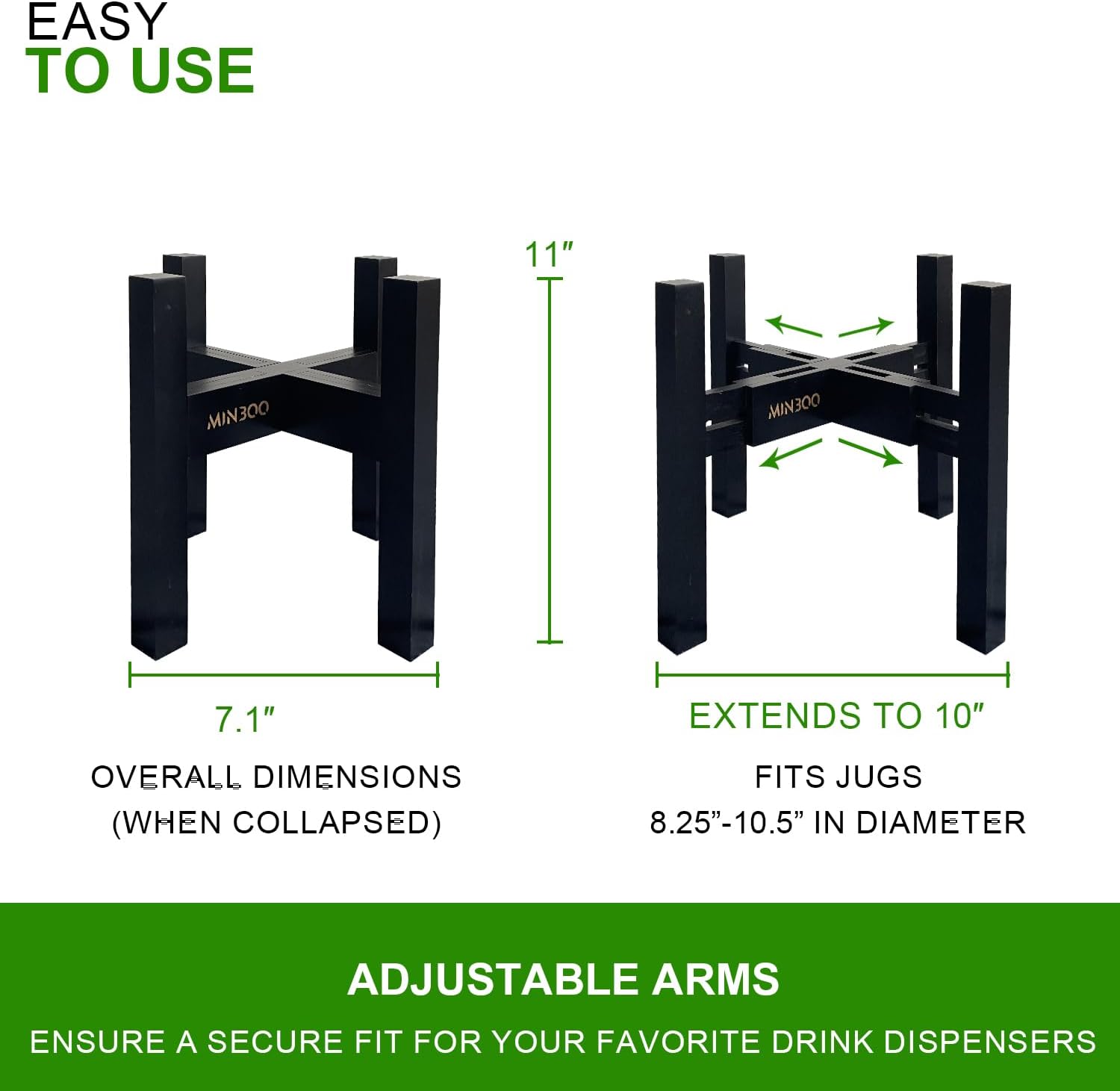 - ADJUSTABLE WIDTH - The drink dispenser stand comes in two size options, with adjustable widths of 7.5-11 inches and 9.35-11.5 inche, which allowing you to place water dispenser of different sizes (6-14.5inch) and giving your water jug 2 height options.