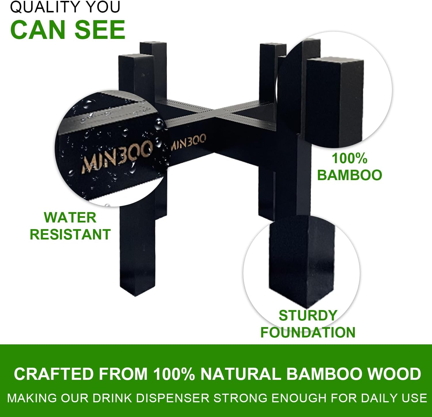 - MULTI-FUNCTIONAL USE - Place any jar with tap on this Minboo bamboo stand to raise it from the surface and make it easier to use and clean. It can be used not only as a water or drink dispenser stand for parties, but also be used as a stand for water filter pitcher, 1-5 gallon water container, water cooler, laundry detergent dispenser, indoor plants, dog bowls, etc.