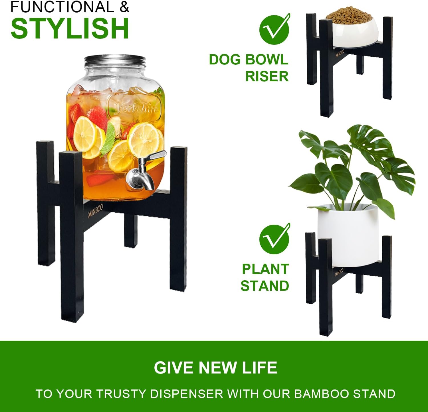 - MULTI-FUNCTIONAL USE - Place any jar with tap on this Minboo bamboo stand to raise it from the surface and make it easier to use and clean. It can be used not only as a water or drink dispenser stand for parties, but also be used as a stand for water filter pitcher, 1-5 gallon water container, water cooler, laundry detergent dispenser, indoor plants, dog bowls, etc.
