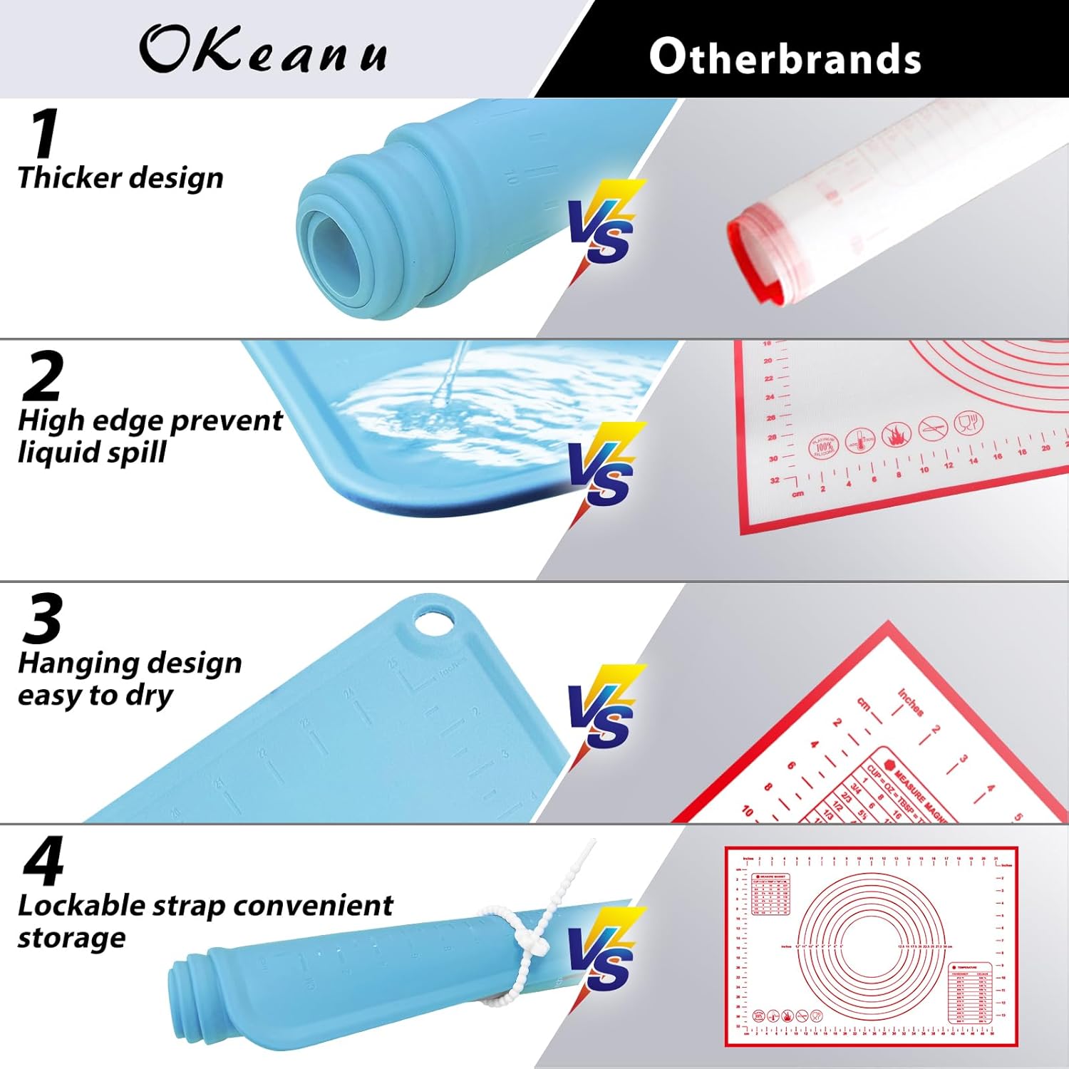 - DOUBLE THICKNESS & DURABLE MAT: The thickness silicone rolling mat is 1.5 mm and edge hightness is 4mm. The unique raised edge design can prevent the water from spilling out when you knead the dough, keep your desk clean.
