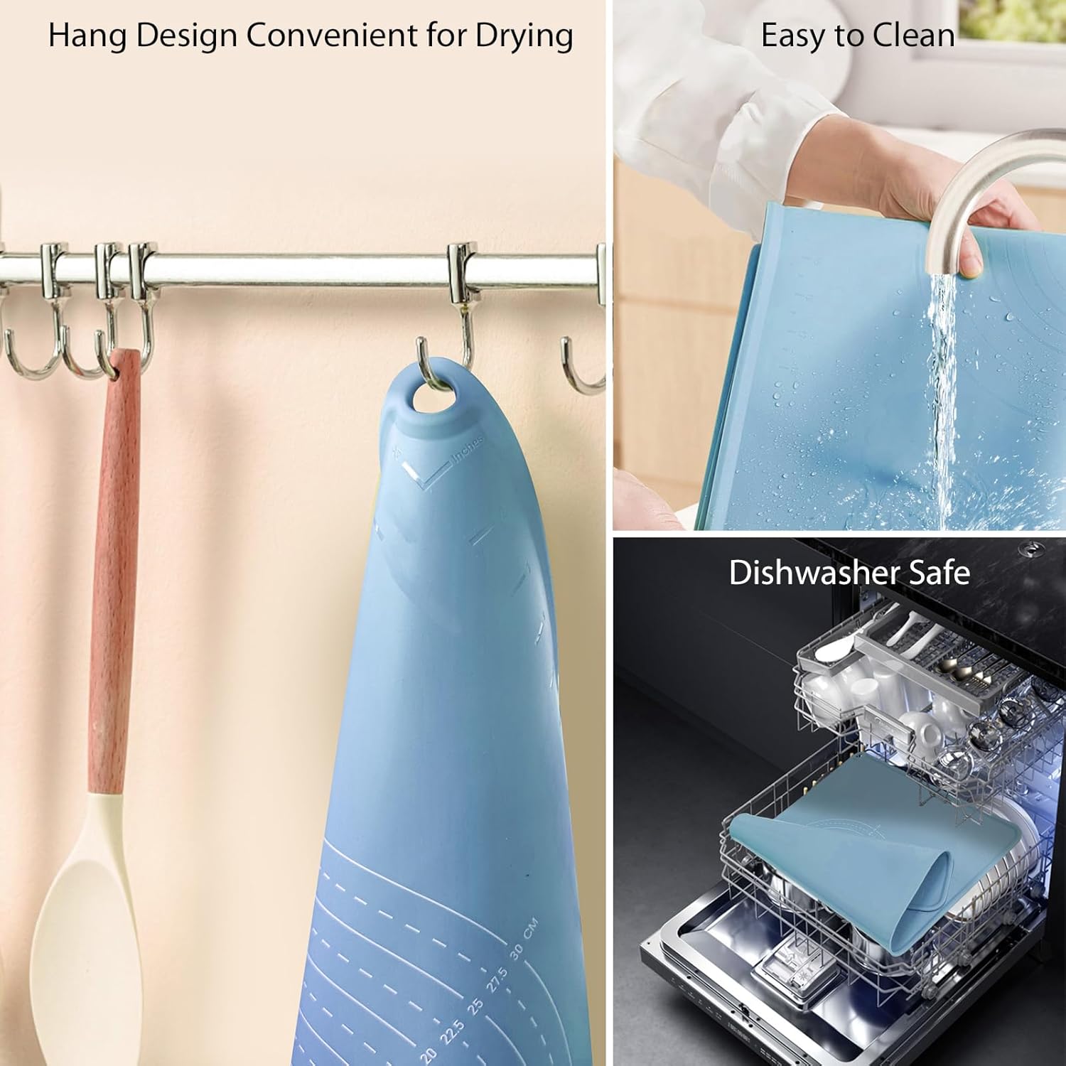 - EASY TO CLEAN AND STORAGE: Simply wash silicone pastry mat under warm soapy water and wipe clean with soft cloth. The surface will not leave residues. The side holes can be easily hung on the kitchen wall then dry itself. Every package has a cute strap, it can be rolled up or folded for easy storage and takes up very little space in drawers or cabinets.
