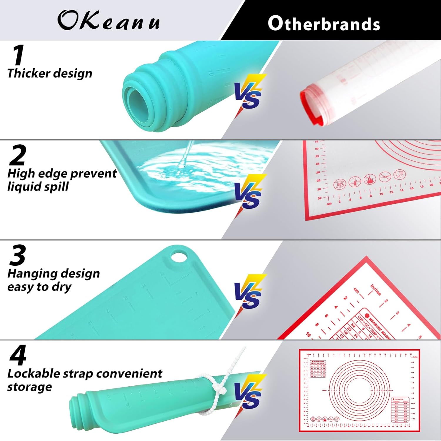 - DOUBLE THICKNESS & DURABLE MAT: The thickness silicone rolling mat is 1.5 mm and edge hightness is 4mm. The unique raised edge design can prevent the water from spilling out when you knead the dough, keep your desk clean.