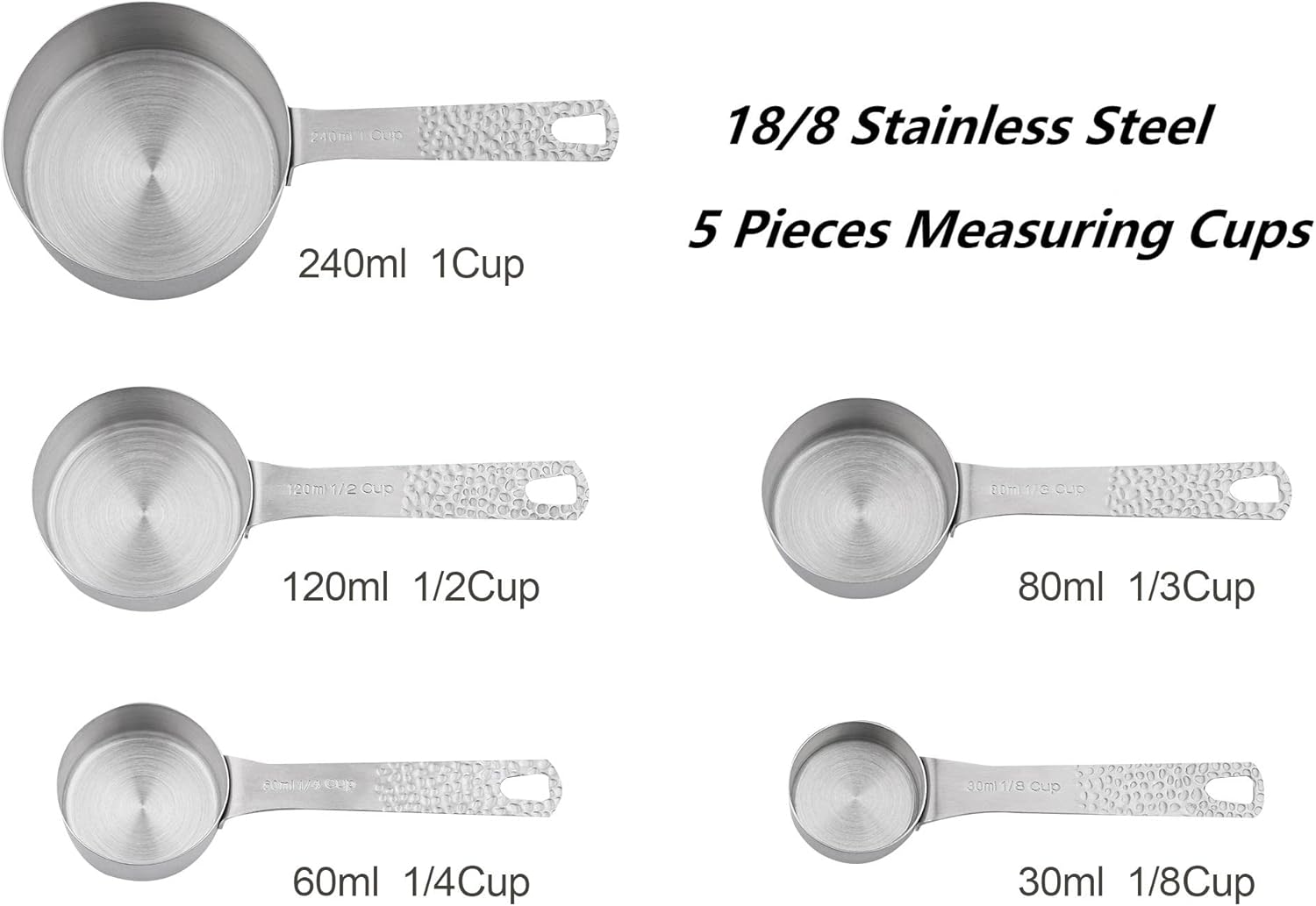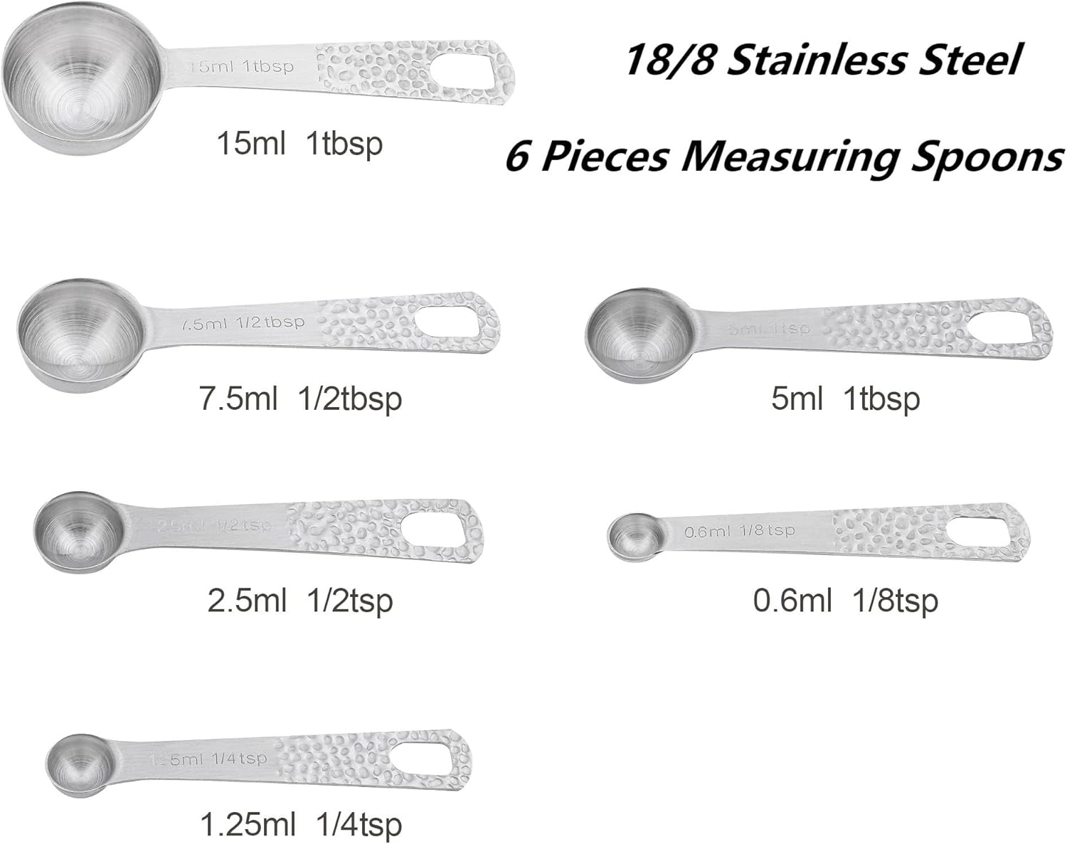 - ▲▲MEASURING CUPS AND SPOONS SET OF 13: 5 measuring cups set:1/8CUP-30ML;1/4CUP-60ML;1/3CUP-80ML; 1/2 CUP-120ML; 1CUP-240ML; 6 measuring spoons set:1/8tsp-0.6ML;1/4tsp-1.25M;1/2 tsp-2.5ML; 1tsp-5ML;1/2tbsp-7.5ML; 1tbsp-15M; 1 X Leveler and 1 measure equivalents.