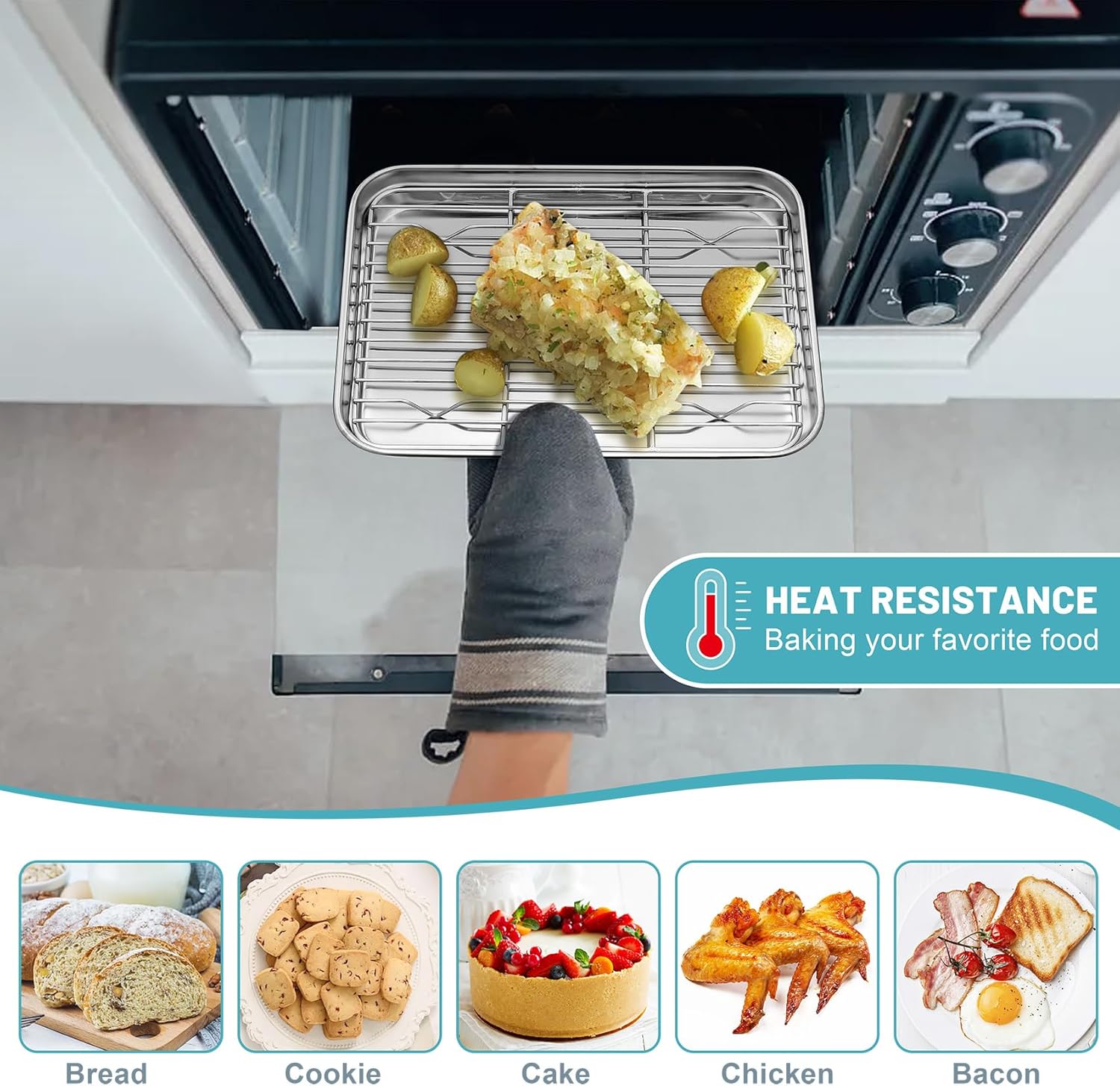 - SMOOTH DENSE WIRES & STABLE FEET: Dense parallel lines keep food from falling through the gap, Smooth edges with no roughness ensure comfortable to grip and transfer, The feet are all curved and baking racks will not scratch the surface when placed on the mini oven pan and countertop