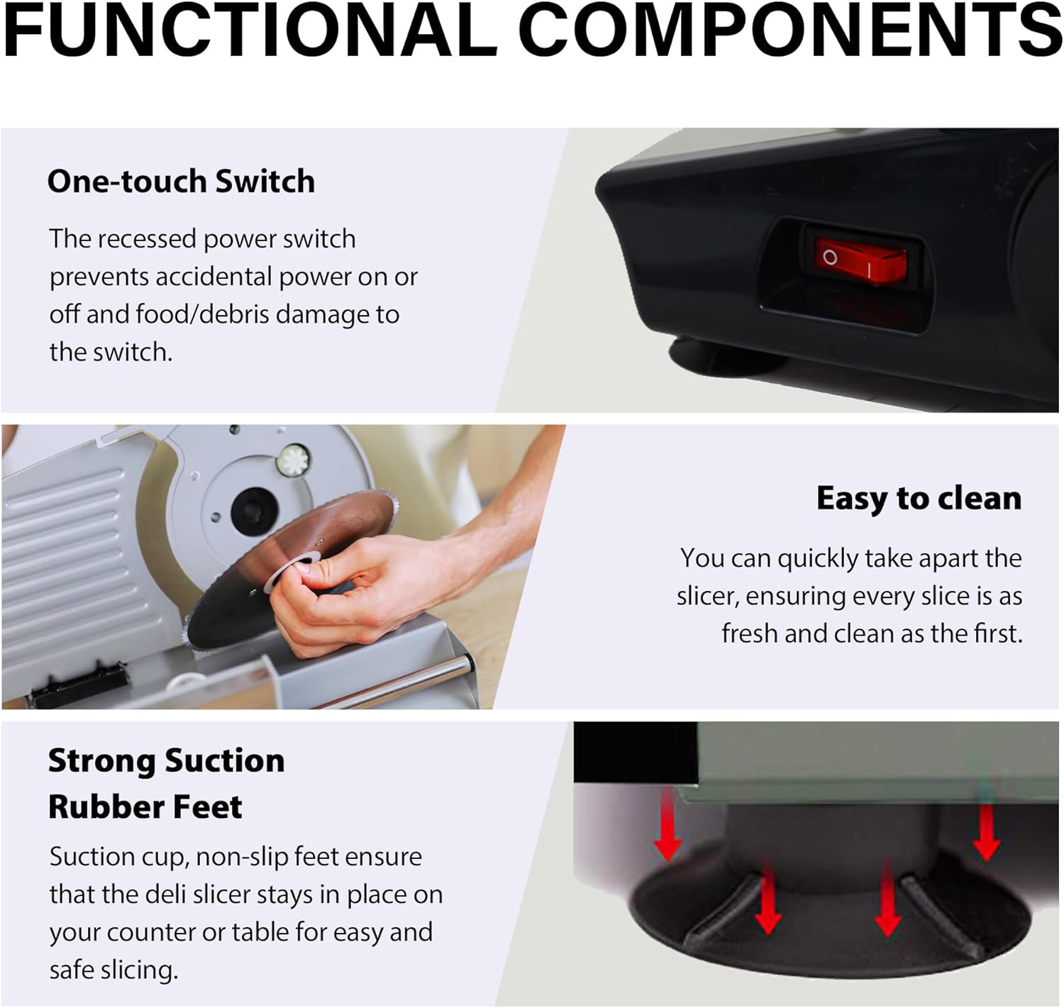 - STRONG POWER: This electric food slicer operates with 180 watts of fast, efficient slicing power. The 7.5'' stainless steel serrated blade is sharp and durable, ideal for slicing meat, deli items, cheese, and more, ensuring your easy work in the kitchen.