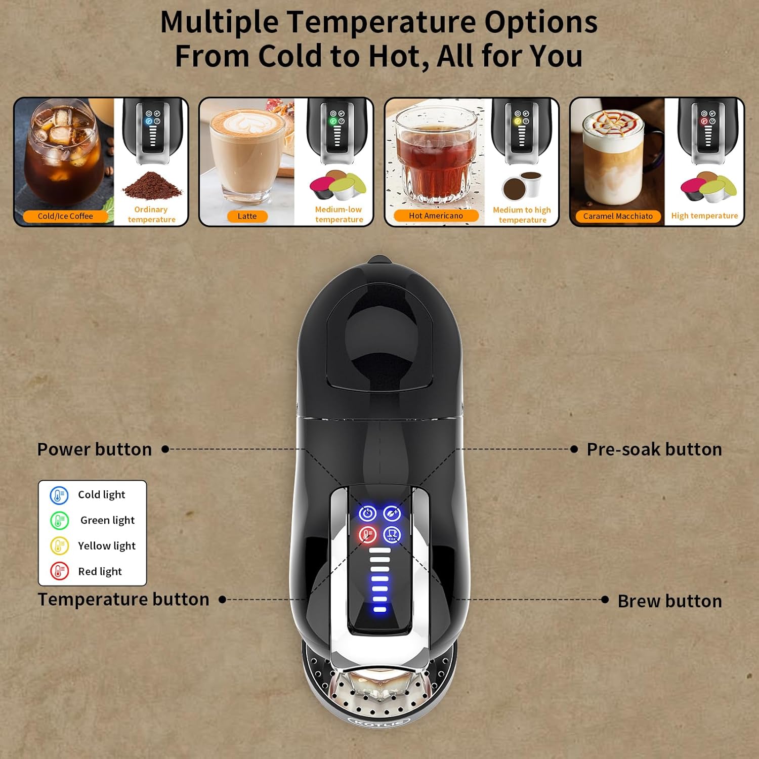 - Hot and cold brewing: The KOTLIE Coffee Machine EM-308A has four temperature options: if cold brewing, please switch the blue light button(real-time water temperature), and add the ice after brewing; If high temperature brewing, please switch the red light(80-85°C/176-185℉); If Medium-high temperature brewing, please switch the yellow light(70-80°C/158-176℉); If medium-low temperature brewing, please switch the green light(65-70°C/149-158℉)