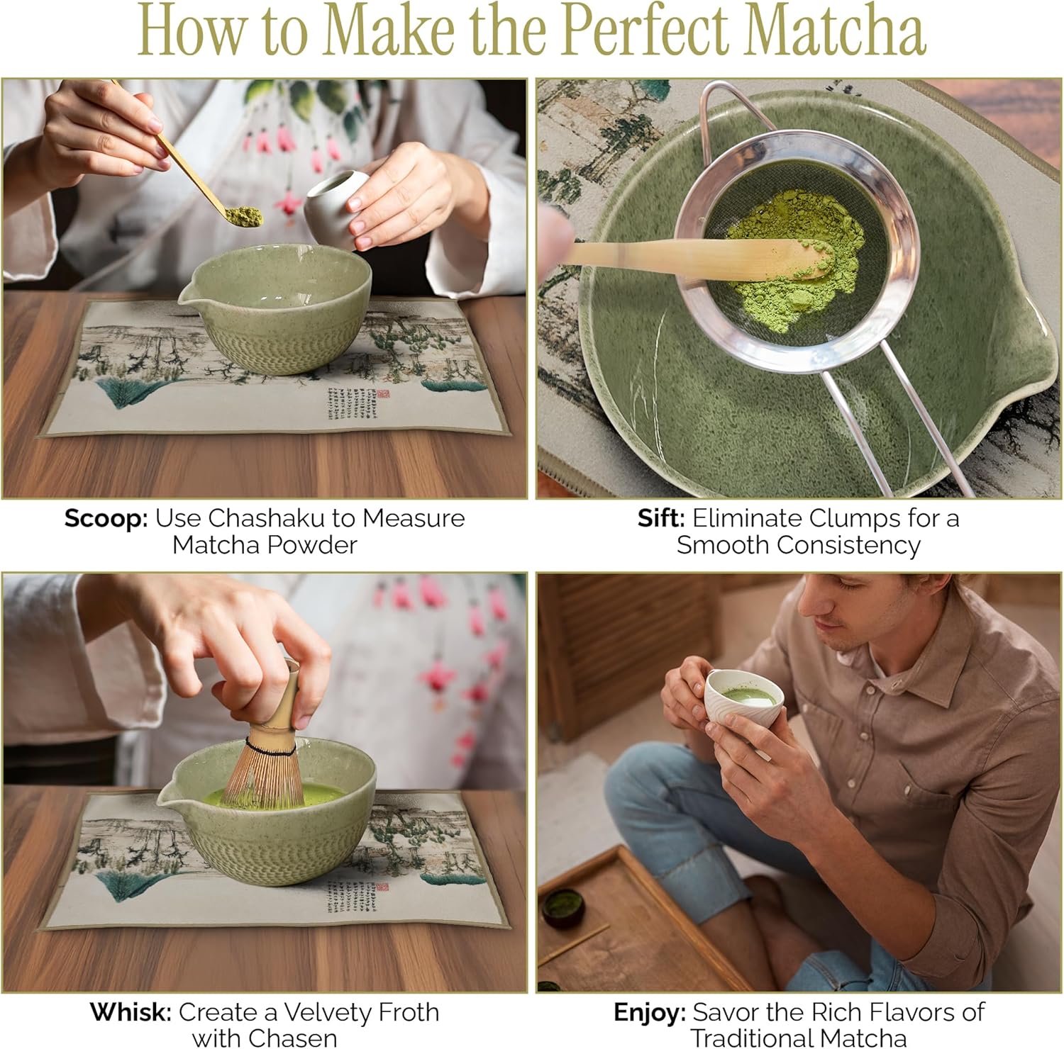 - 【EASY TO USE & LEARN】This matcha tea set includes a detailed instruction book that makes learning easy for beginners. Whether you're using a matcha wisk, a matcha sifter, or mastering the matcha whisk set technique, the guide helps you enjoy the art of tea with your complete matcha set whisk and bowl.
