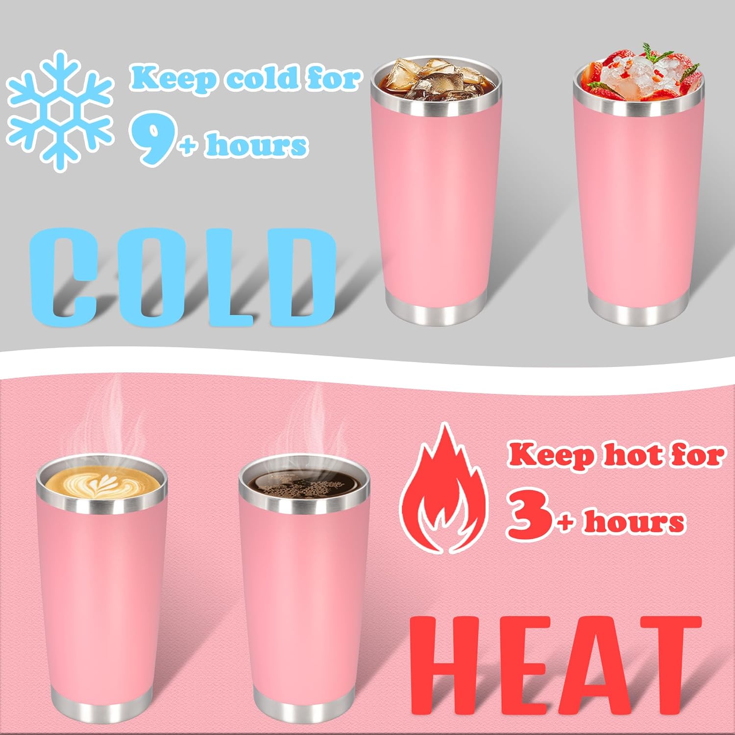 - DOUBLE WALL VACUUM INSULATED - The travel coffee tumblers use double wall vacuum insulated design, which can isolate the transfer of heat and cold. The tumbler can keep hot for over 3 hours and keep cold for over 9 hours, suitable for water, coffee, juice, cola and so on. You can enjoy your on the go drinks throughout your travels or commutes