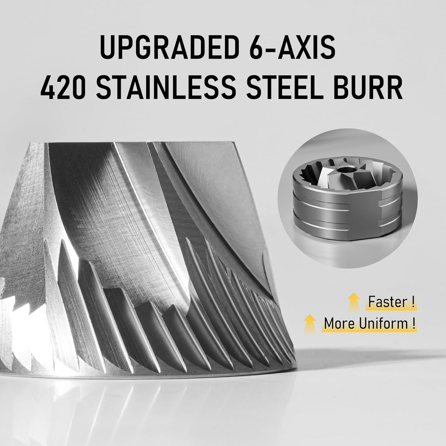- [2025 UPGRADED VERSION] STARESSO D6 PLUS Coffee Grinder upgraded with 6-Axis CNC burr and all-metal body. Crafted from high-quality 420 Stainless Steel conical burr, it ensures uniform grinding and consistent grounds for every brew, delivering unparalleled flavor with dual bearing precision.